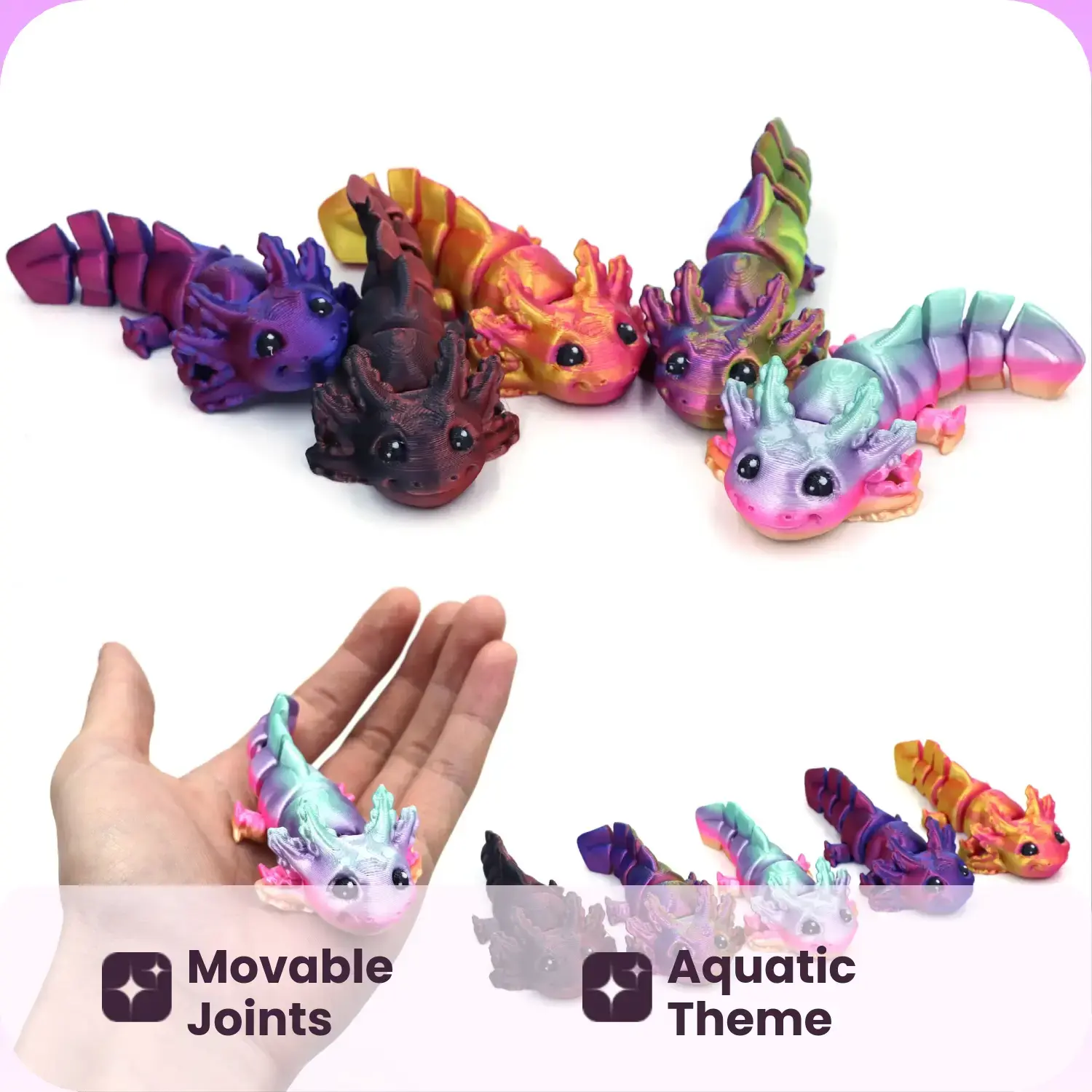 [Articulated Feature]: The 3D printed axolotl features movable joints, allowing for dynamic poses and enhancing its playful character.