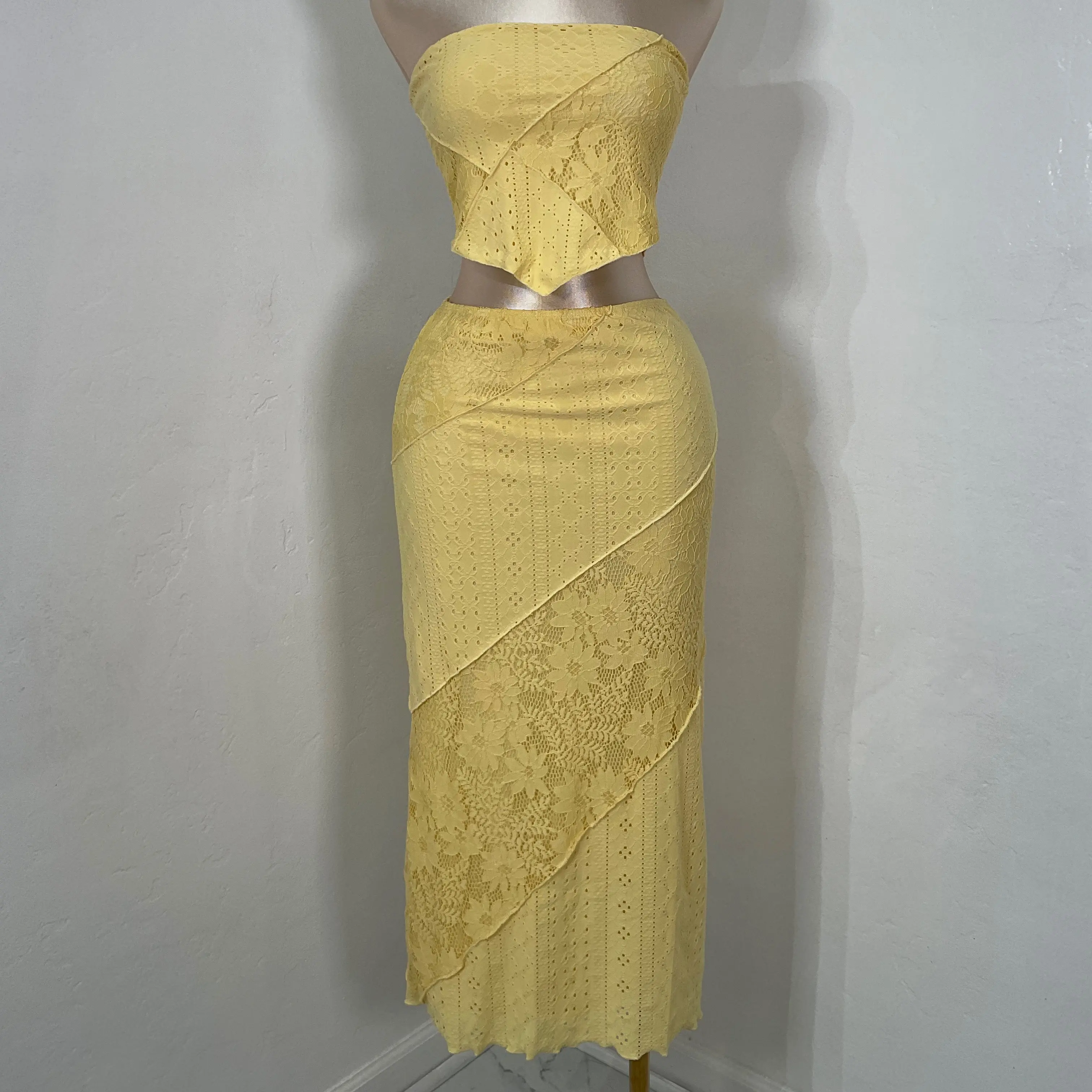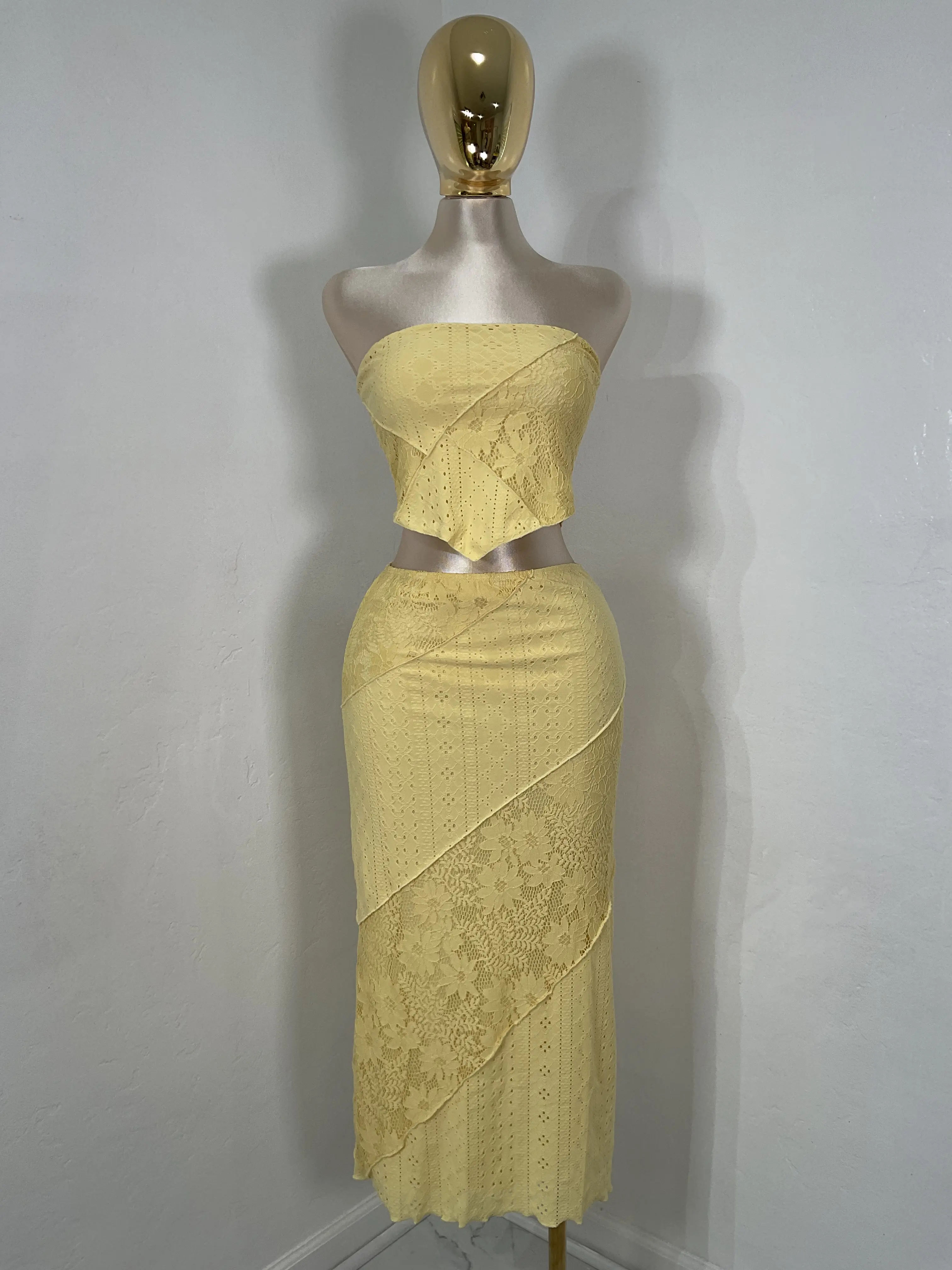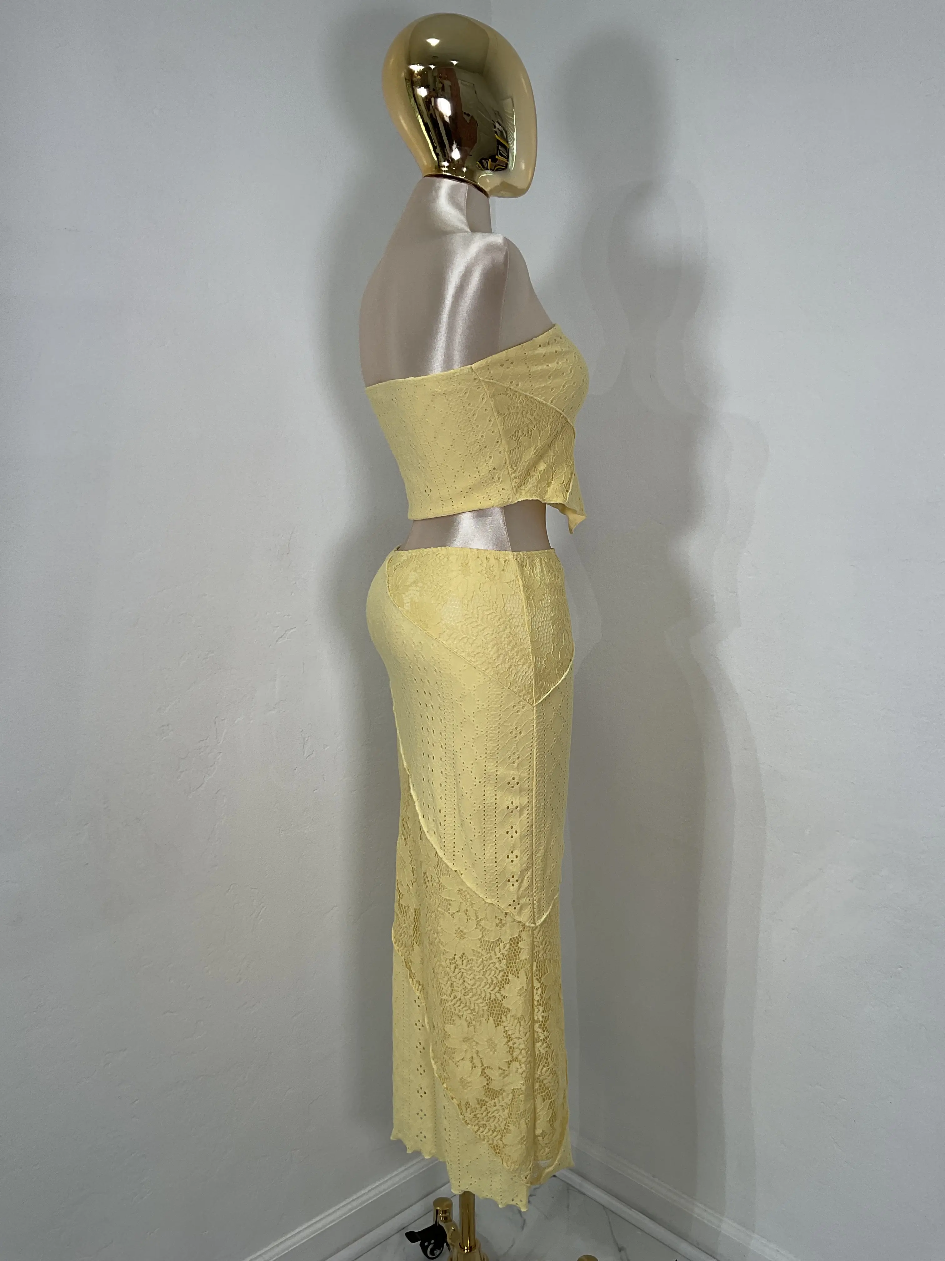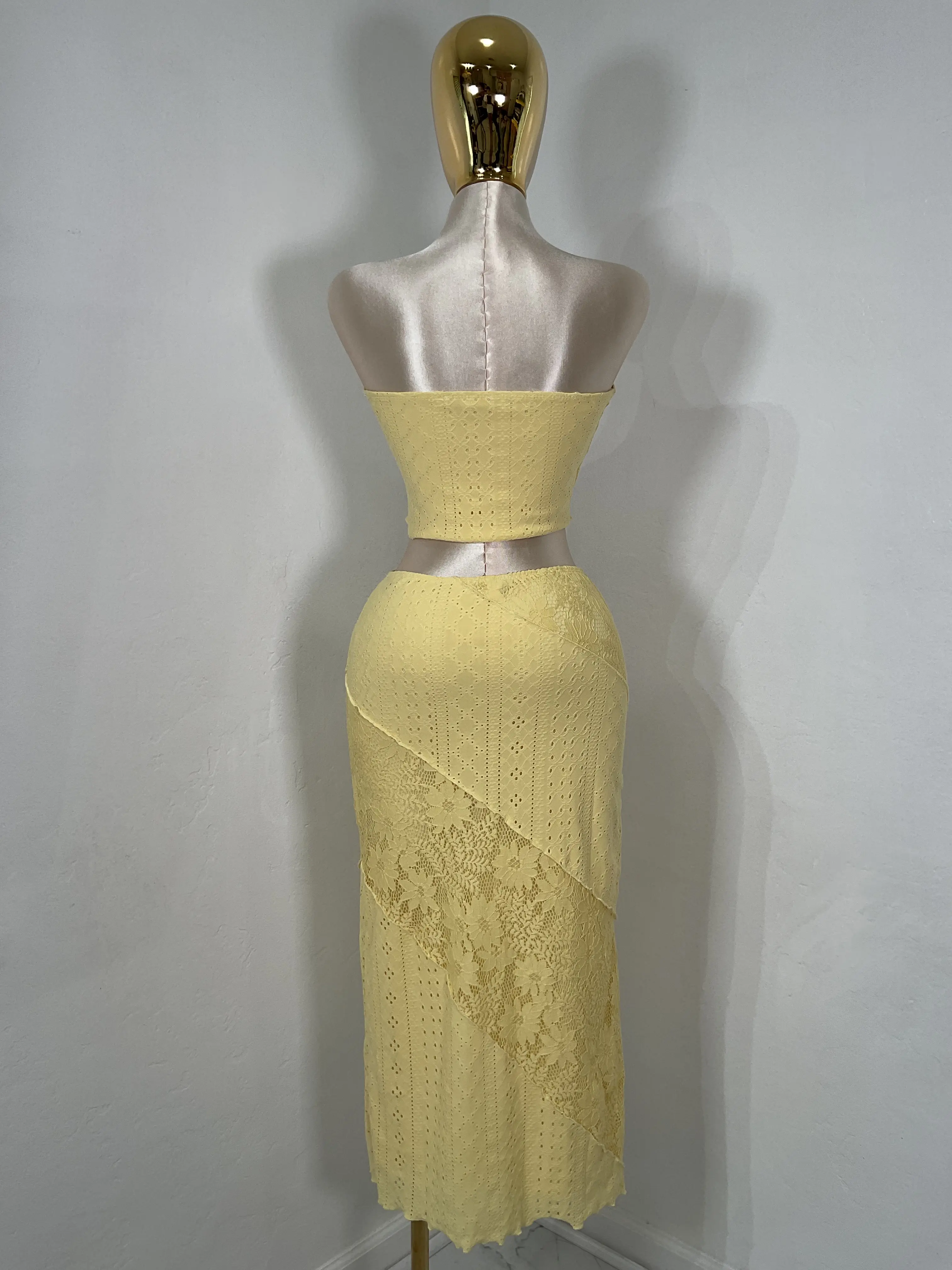 set de top straple y falda larga en tela con mucho stretch la modelo esta usando la talla small