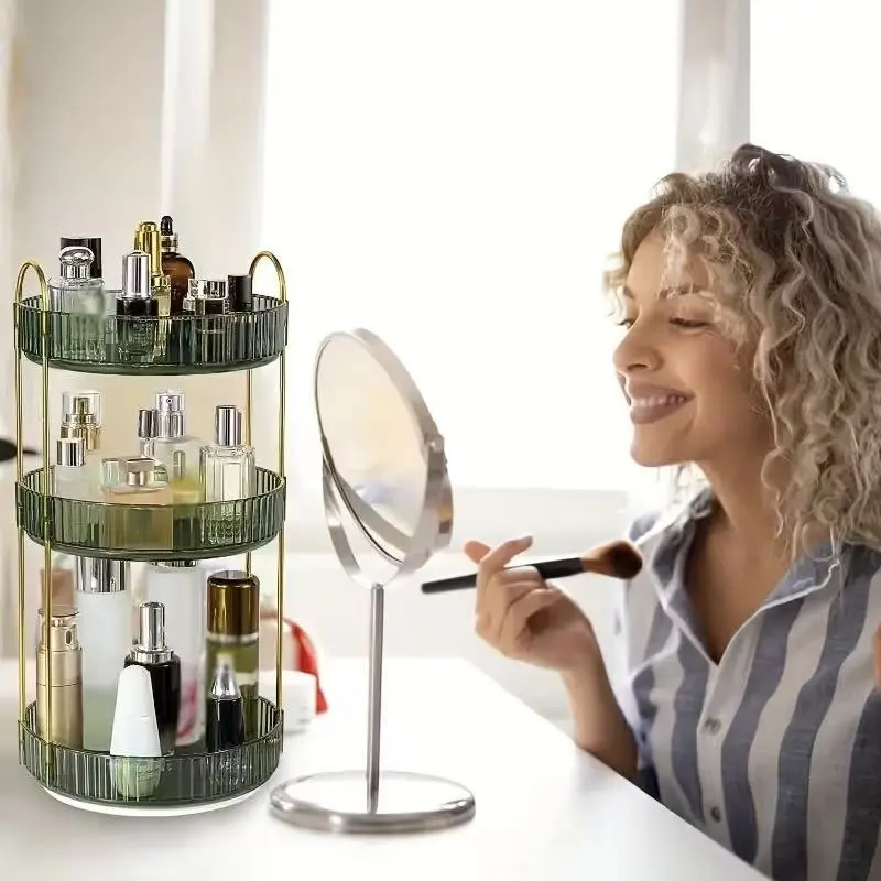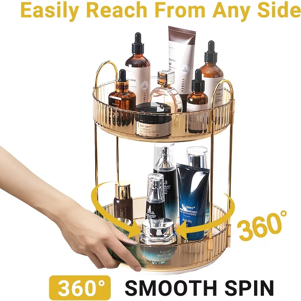 This 2–3 tier 360° smooth rotating makeup organizer is made of high-quality acrylic, with large capacity and a clear, modern design. It provides plenty of space for your cosmetics, perfumes, skincare, lotions, brushes and lipsticks. The dustproof cover keeps your items clean, while the stackable design allows you to adjust layers according to your needs.
