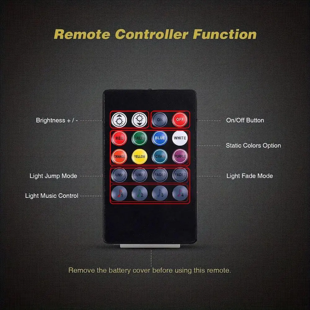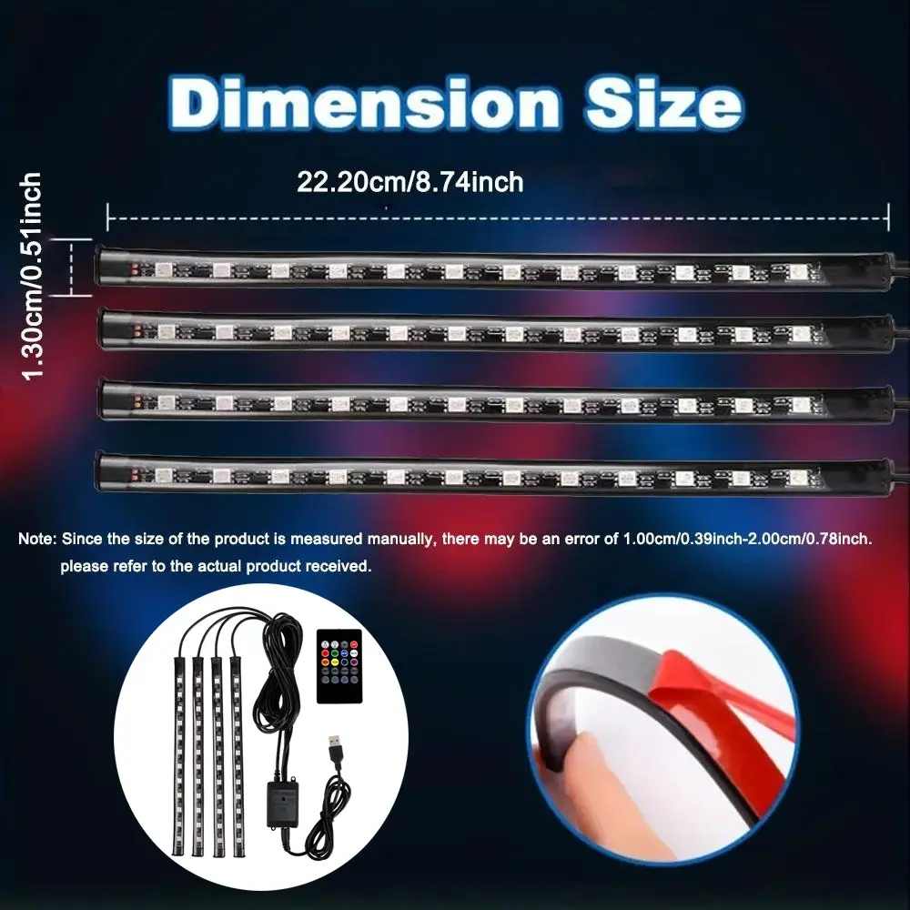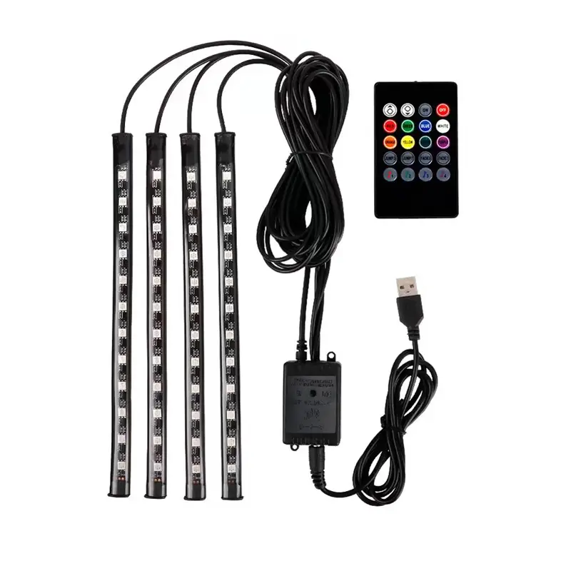 8 Color RGB LED Car Interior Atmosphere Lights: Music and Remote Control enable you to change the color and adjust the brightness as you wish