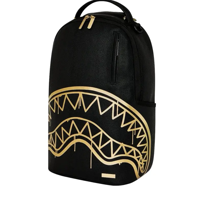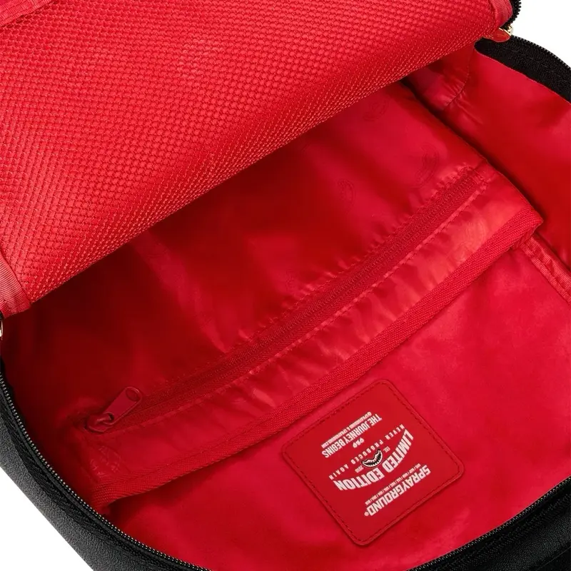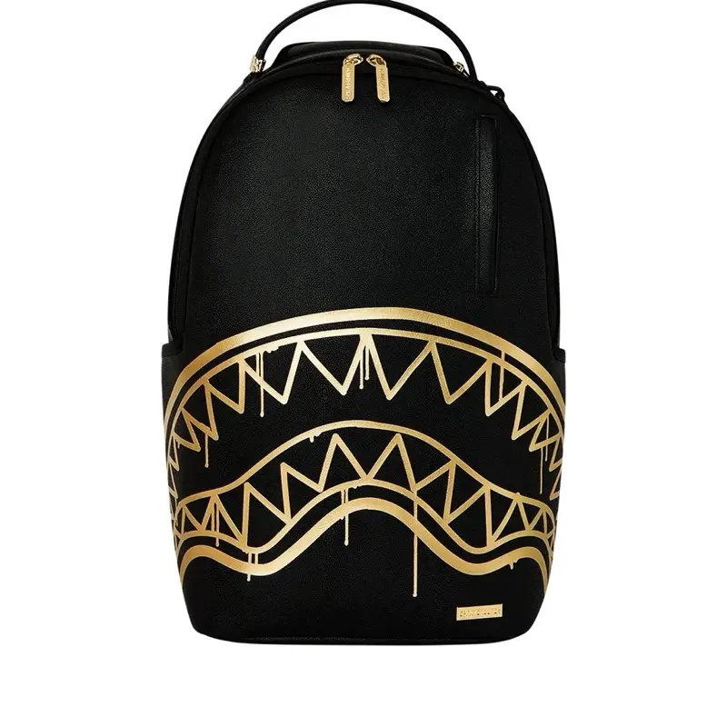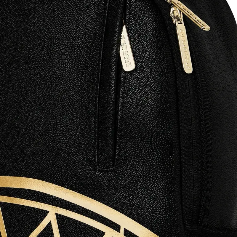 Dimensions: 18" x 6" x 11.5" • Front zipper pocket • Side pockets • Zippered Stash pocket • Separate velour sunglass compartment • Ergonomic mesh back padding • Adjustable Straps for custom sizing • Gold zippers with metal hardware • Metal "Sprayground Authentic" badge • Slide through back sleeve connects to carry-on luggage to free your hands