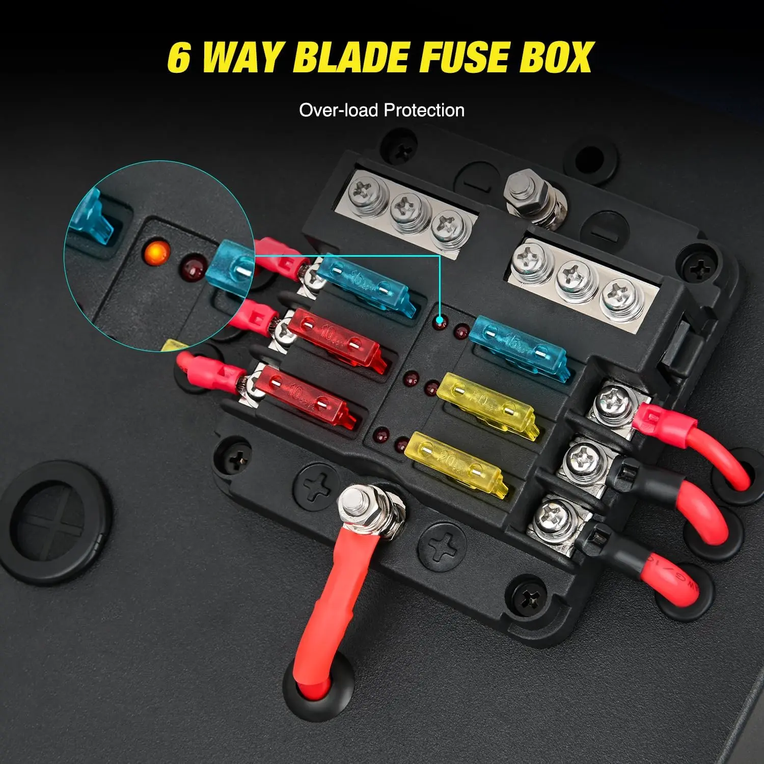 ·Safe and Stable: Provides a 6-way waterproof fuse box to effectively protect the circuit, prevent current overload and short circuit, and ensure power safety. Constructed with the LED voltage display, provides a real-time voltage monitoring, allows you to check the status of the voltage. The control box is equipped with upgradeable and rational wiring,including bus bar binding post for positive and negative poles,heavy-duty cables for high current loads,circuit safety