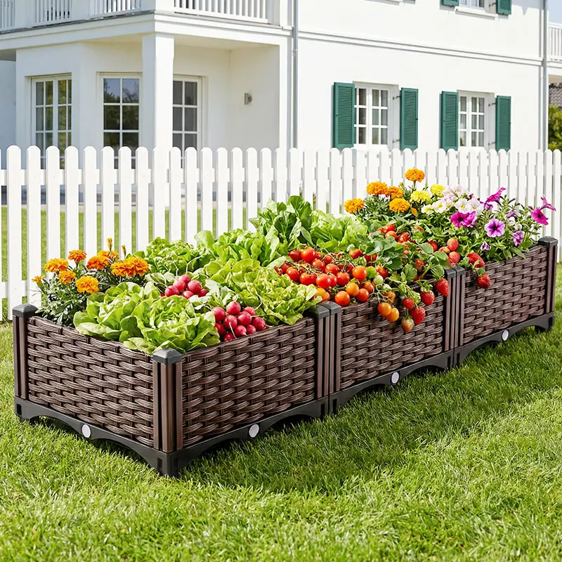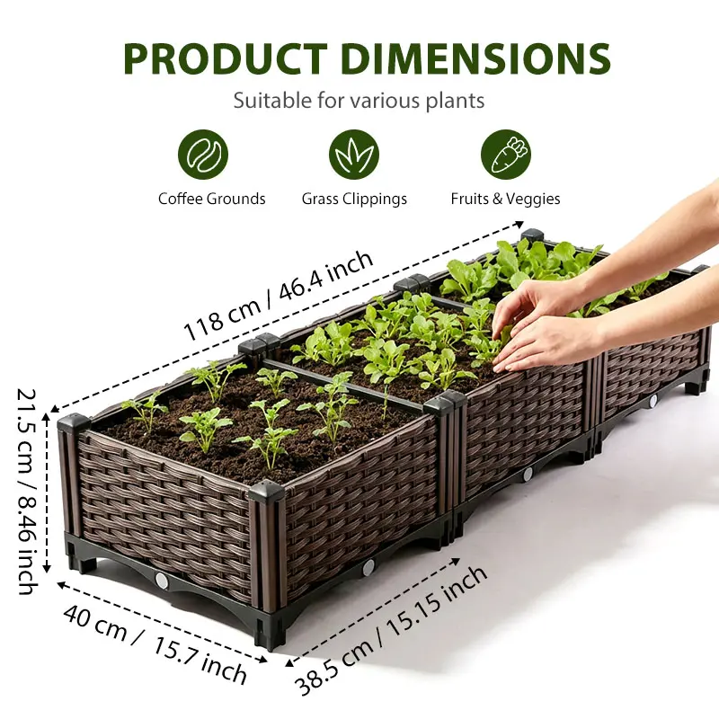 Upgrade your gardening with our spacious planter box. Made from strengthened PP, it's heat, frost, and water-corrosion resistant. No screws needed for assembly, ensuring quick setup. Dimensions: 46.4" x 15.7" x 8.46". Perfect for vegetables, herbs, and flowers.