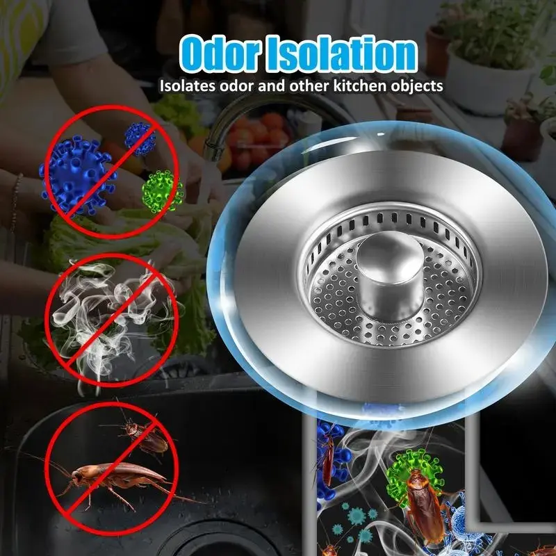 【Upgraded 3 in 1 Kitchen Sink Drain Strainer】 Our kitchen sink strainer, combines sink drain strainer, kitchen sink stopper and odor isolation together. Press down the pop up button to store water for washing, press again to drain water while catching food waste or scrap from going down the drain. A reliable anti clogging helper.