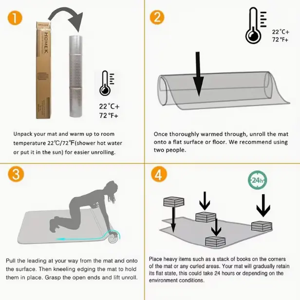 Instructions for Flattening the Chair Mat: Due to weather conditions and shipping, the PVC chair mat may not be perfectly flat when you receive it. To remedy this, soak the mat in hot water for a few minutes to soften it, or place it under the weight of other heavy objects in your home to flatten it.