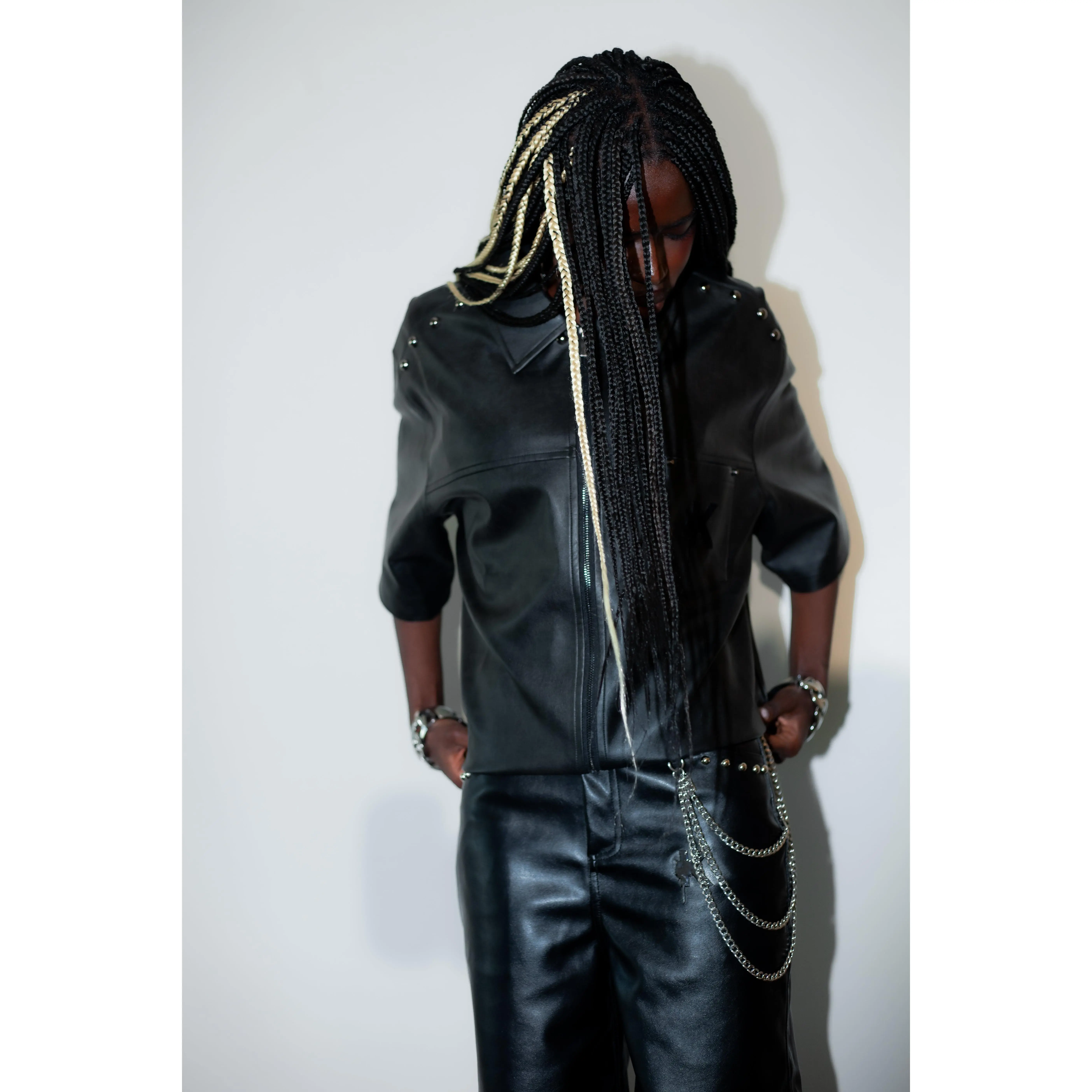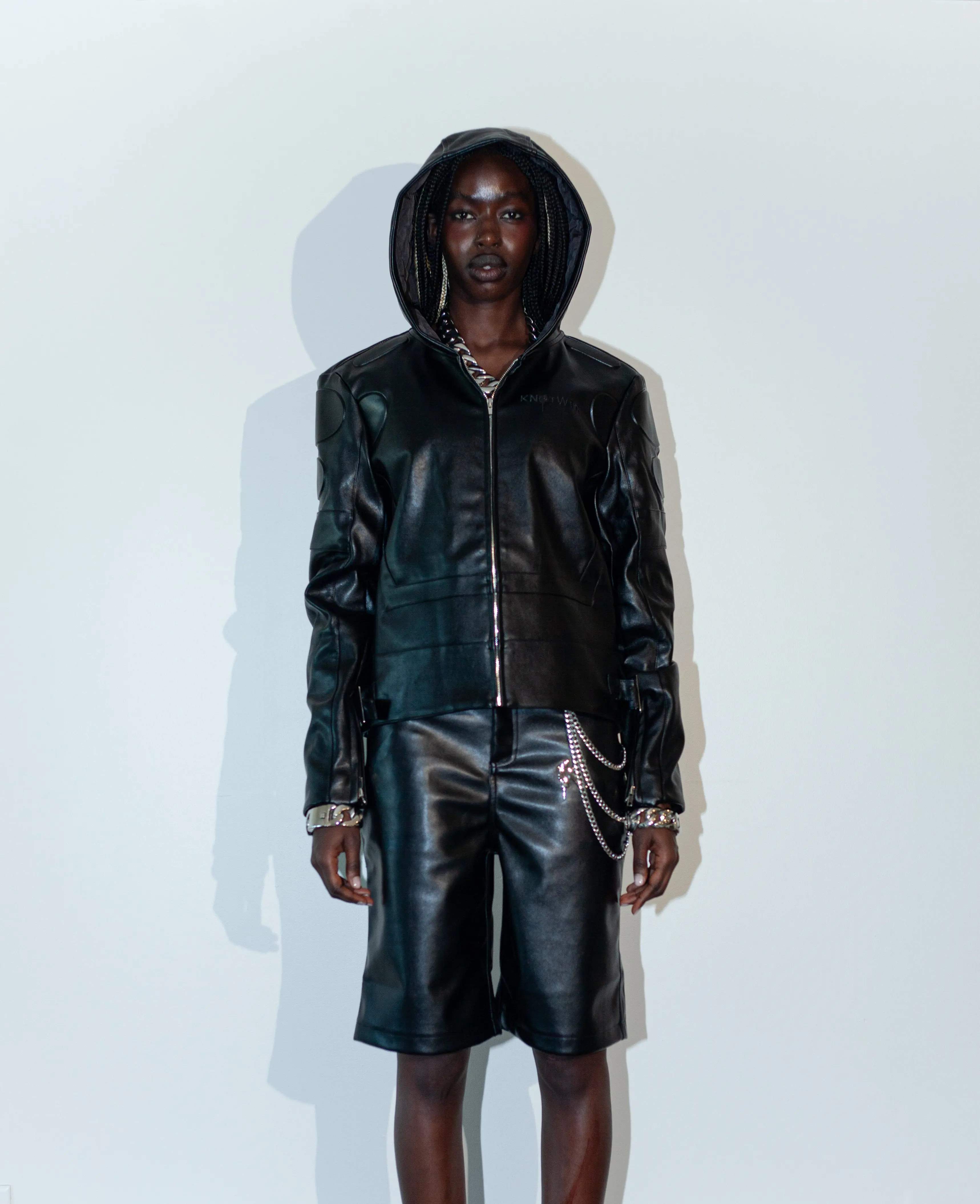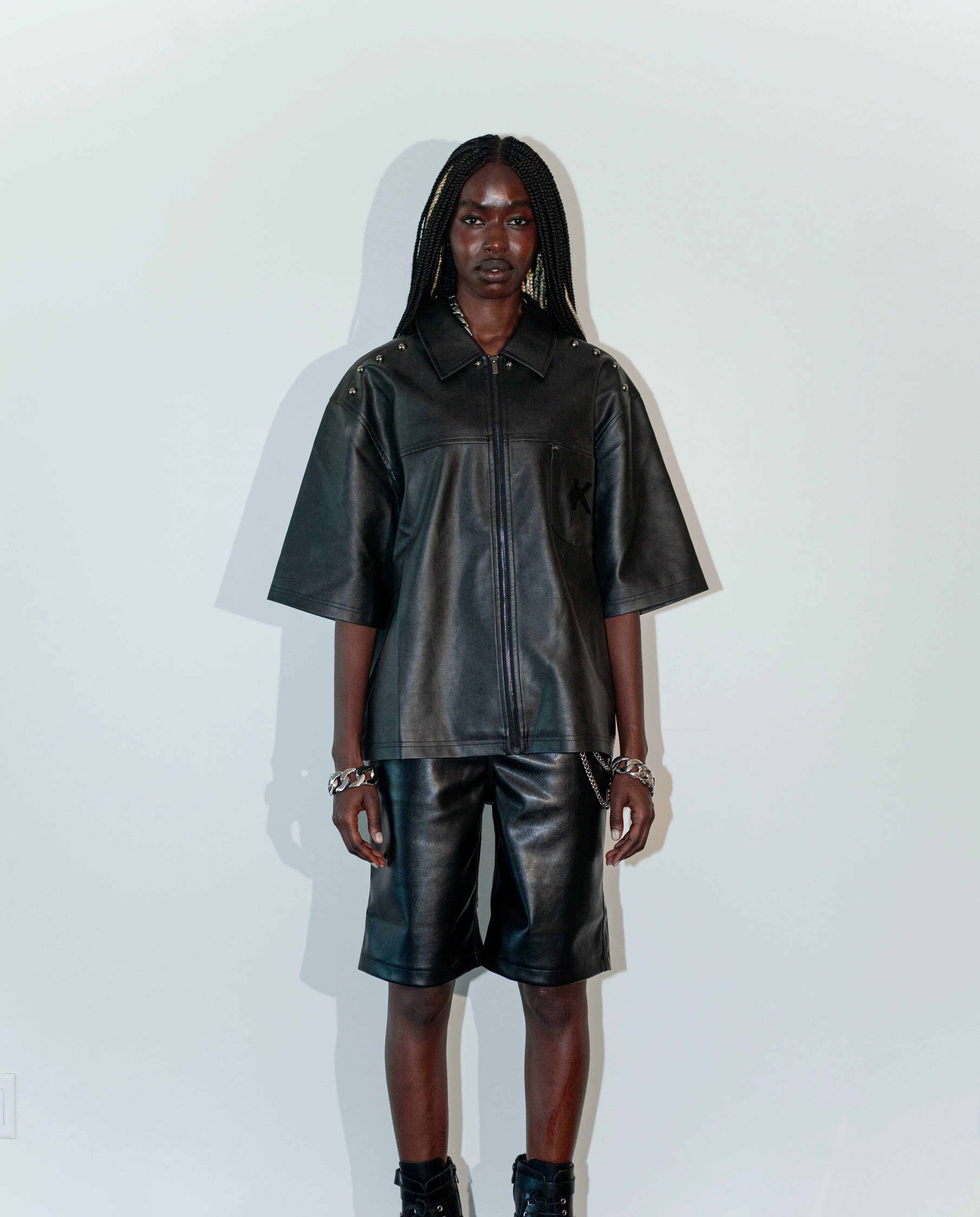 Crafted to command attention, this leather jacket blends bold detailing with refined structure. Designed with the signature K logo positioned at the pocket region, it delivers a subtle yet distinctive brand statement. The front pockets are finished with metal stud embellishments, adding a striking edge and elevated texture to the piece. With its structured silhouette and statement hardware detailing, this jacket is made for confident styling, effortlessly transitioning from day to night.