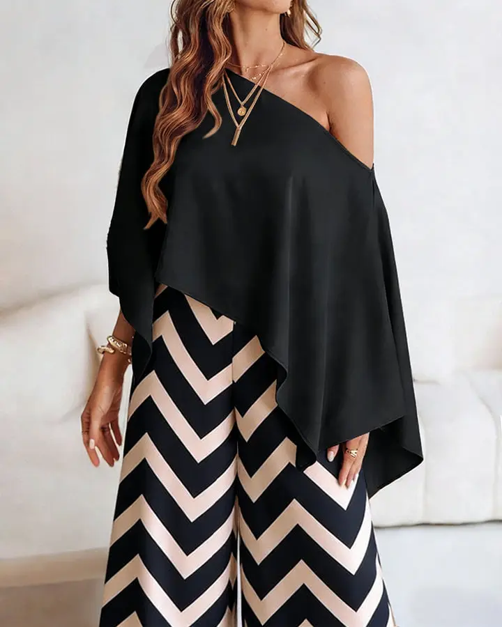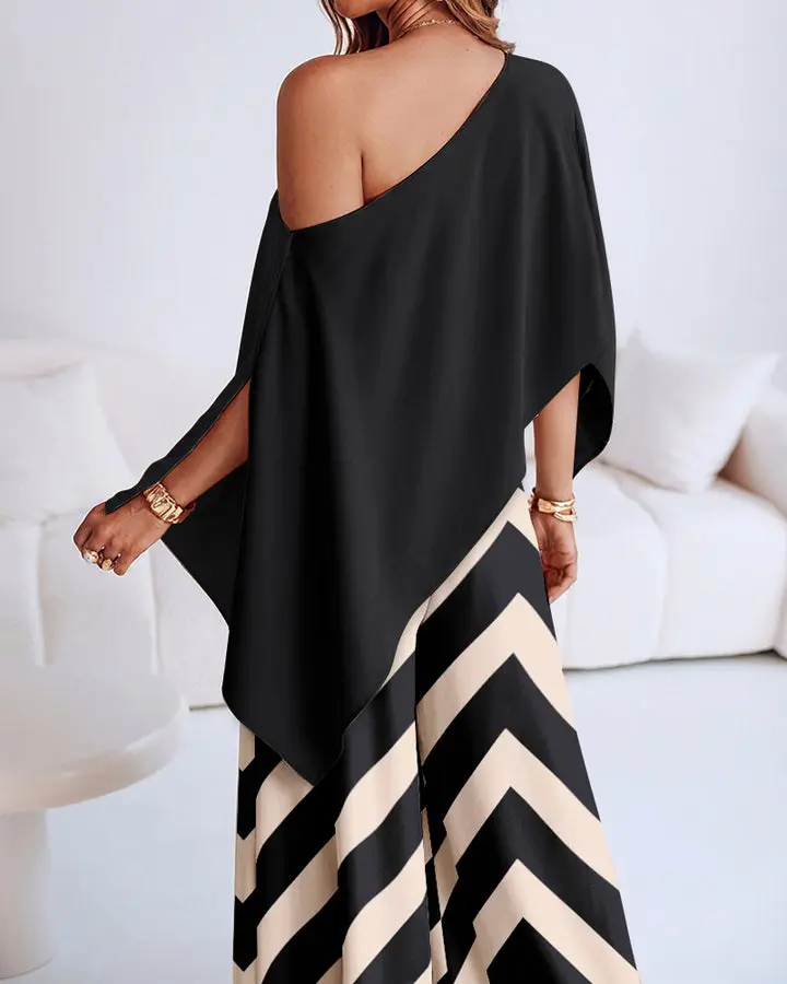 ·Silhouette - Elongated Flattering Fit Featuring high-waisted wide-leg pants and a multi-wear asymmetric cape top. This chic combination is designed to follow your body’s natural lines while creating a visually lengthening, statuesque effect.