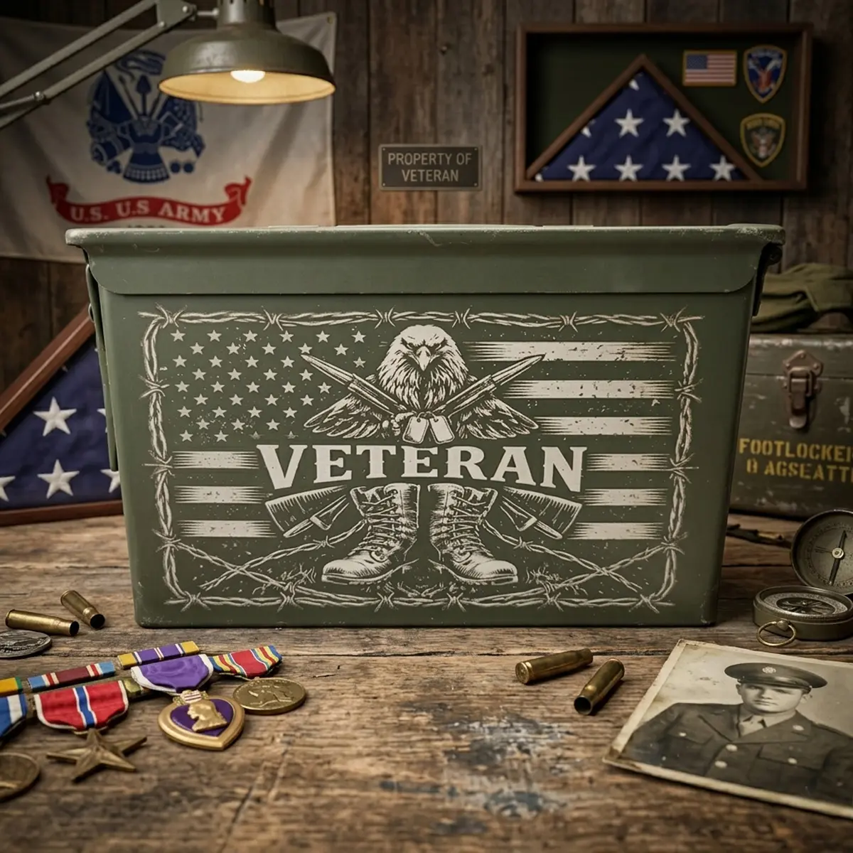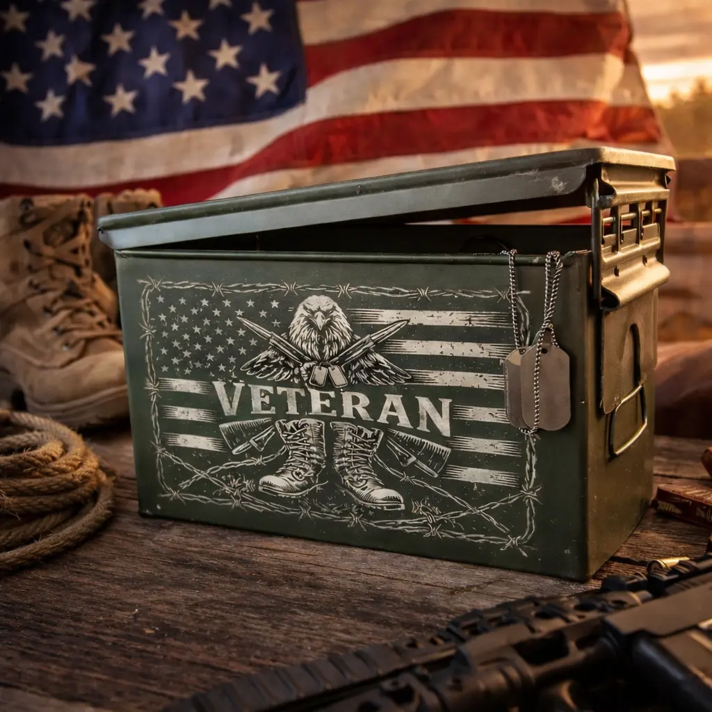 Laser Engraved "Veteran Eagle" Grade 1 Ammo Can - Choose from 30cal, 50 Cal or FAT 50 Can