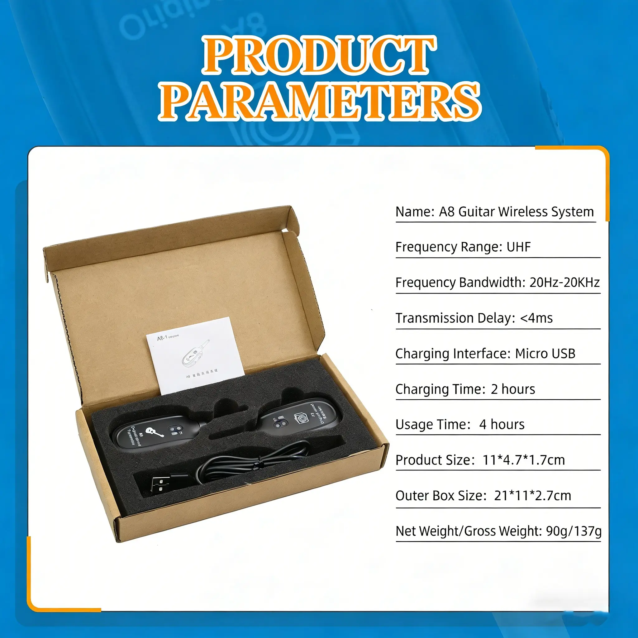 A8 Professional Instrument Wireless Transmitter, Low Latency Uhf Audio System, Ideal for Guitar Bass String Instruments, Studio Stage Perfect Choice