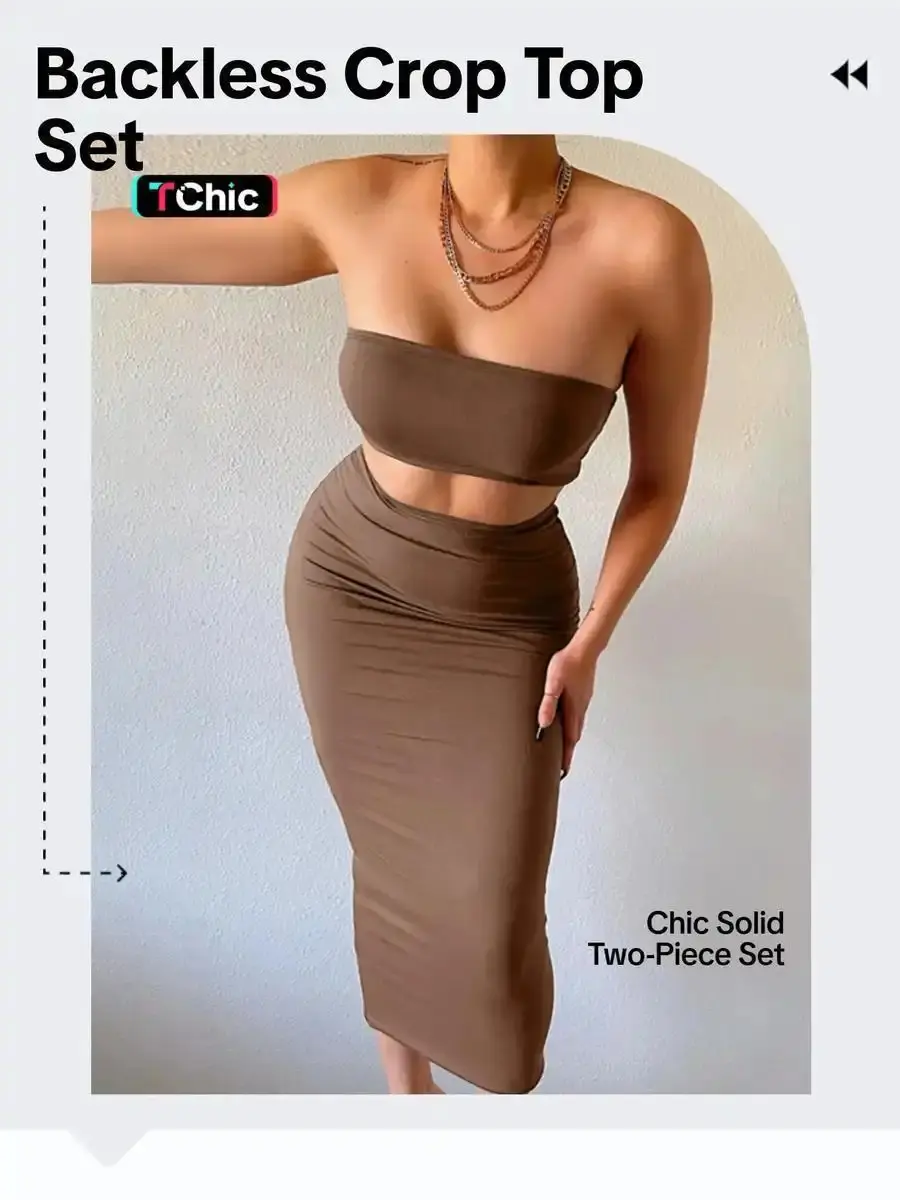 Women 2 Counts Solid Backless Crop Tube Top High Waist Skirt Set Sleeveless Strapless Top Bodycon Skirt Set for Party Club Dating Ladies Summer Clothes