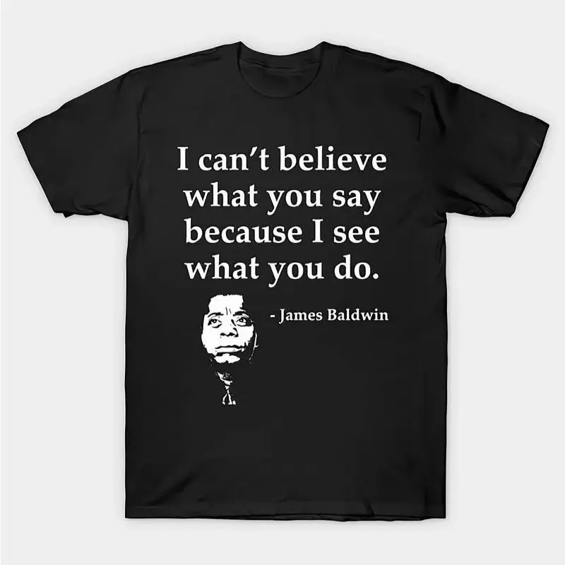 This premium tee features the iconic quote from James Baldwin: "I can't believe what you say because I see what you do", printed in a crisp, high-contrast white font against a classic black background. Accompanied by a striking profile silhouette of Baldwin himself, the design merges visual art with timeless wisdom, making it a standout piece for literature lovers, social justice advocates, and anyone who values authenticity. Crafted with fade-resistant ink, the graphic maintains its sharpness and clarity wash after wash, ensuring your message remains as impactful as the words themselves.