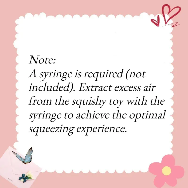 [Instructions for Use]:Use a syringe to remove excess air from the interior of the squishy toy.This step ensures the best user experience during squeezing.