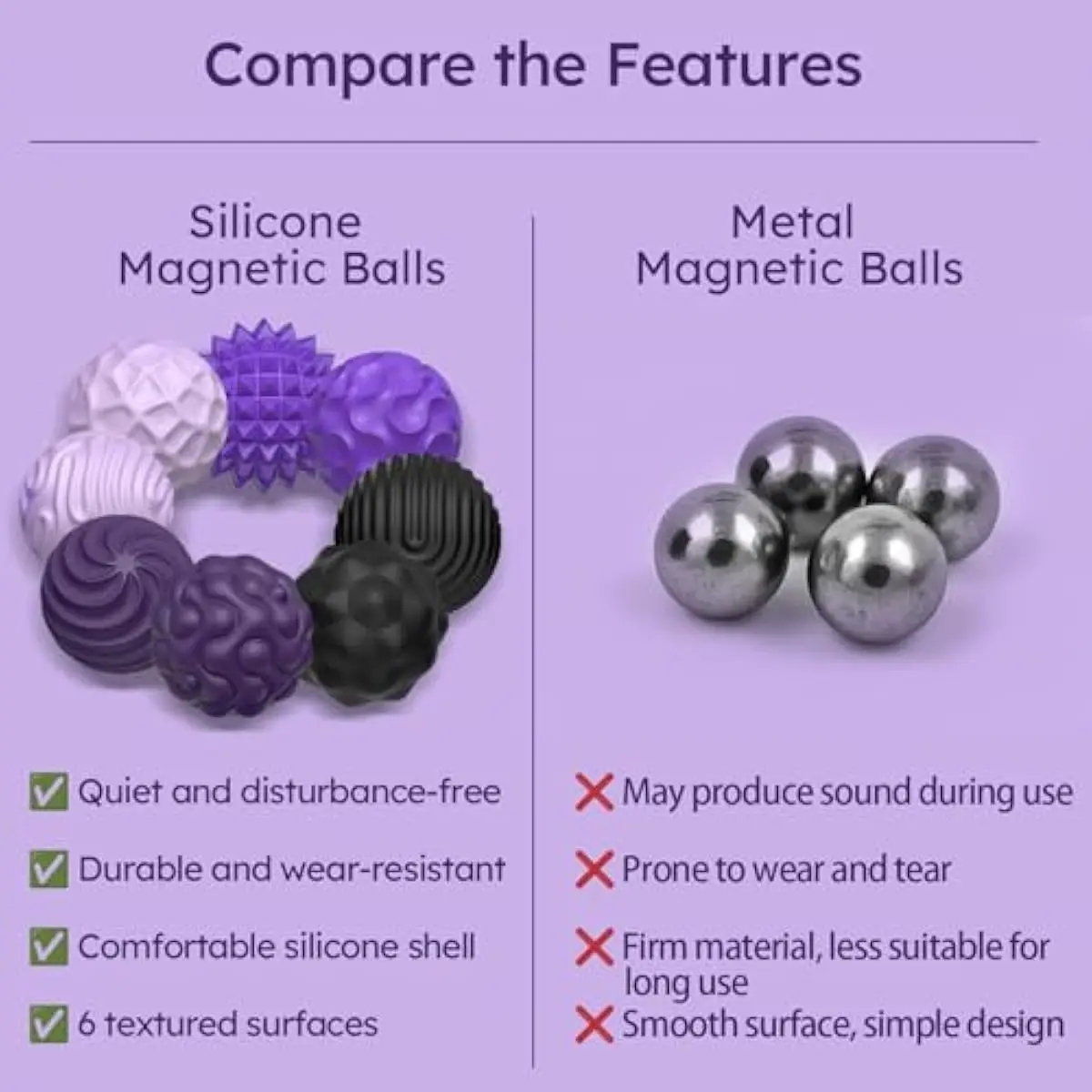 Quiet and Silent PlayOur silicone Magnetic balls are completely silent, whether you're in the office, classrooms, library, or meeting room, gently rubbing, rolling, or connecting them makes no annoying noise, allowing you to release stress and focus in quiet environments.