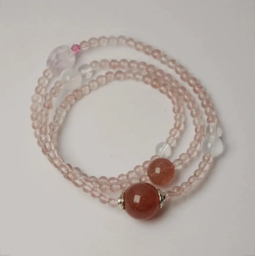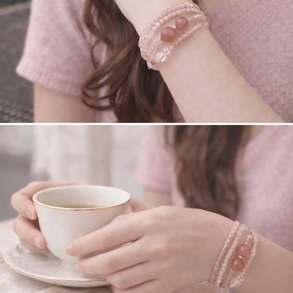 Inspired by light sweetness and clarity, this piece layers strawberry quartz, rose quartz, and clear quartz into a triple-wrap bracelet with a soft, romantic allure.