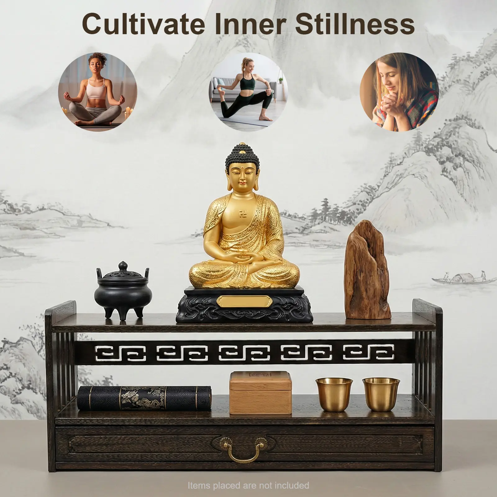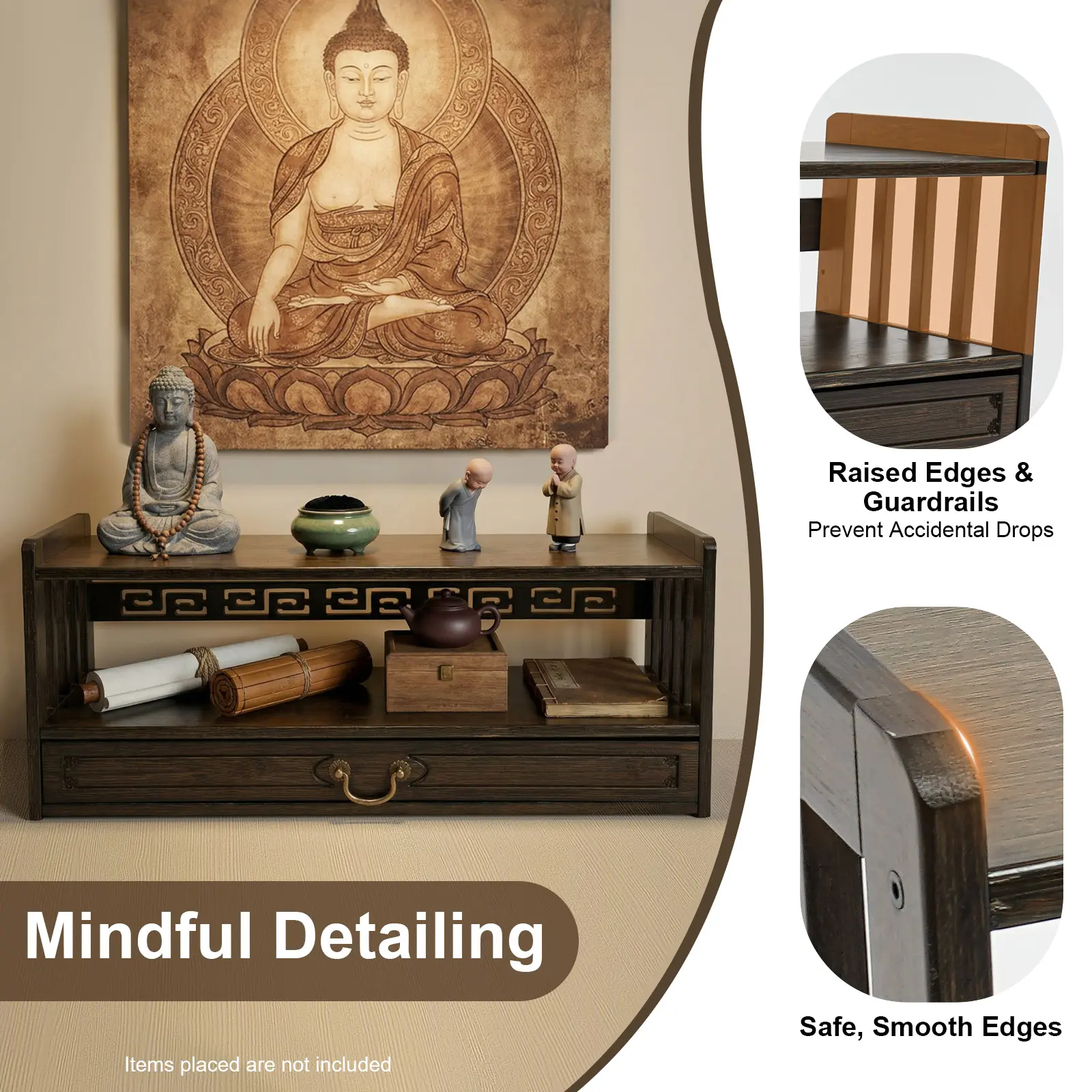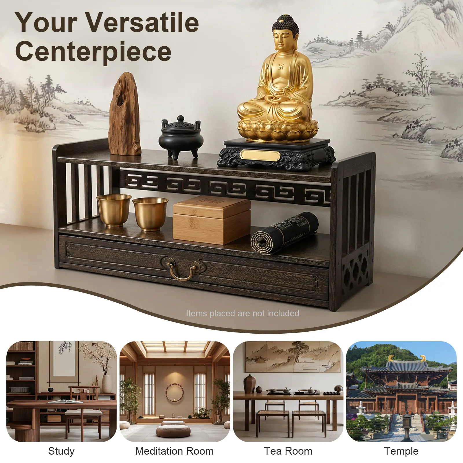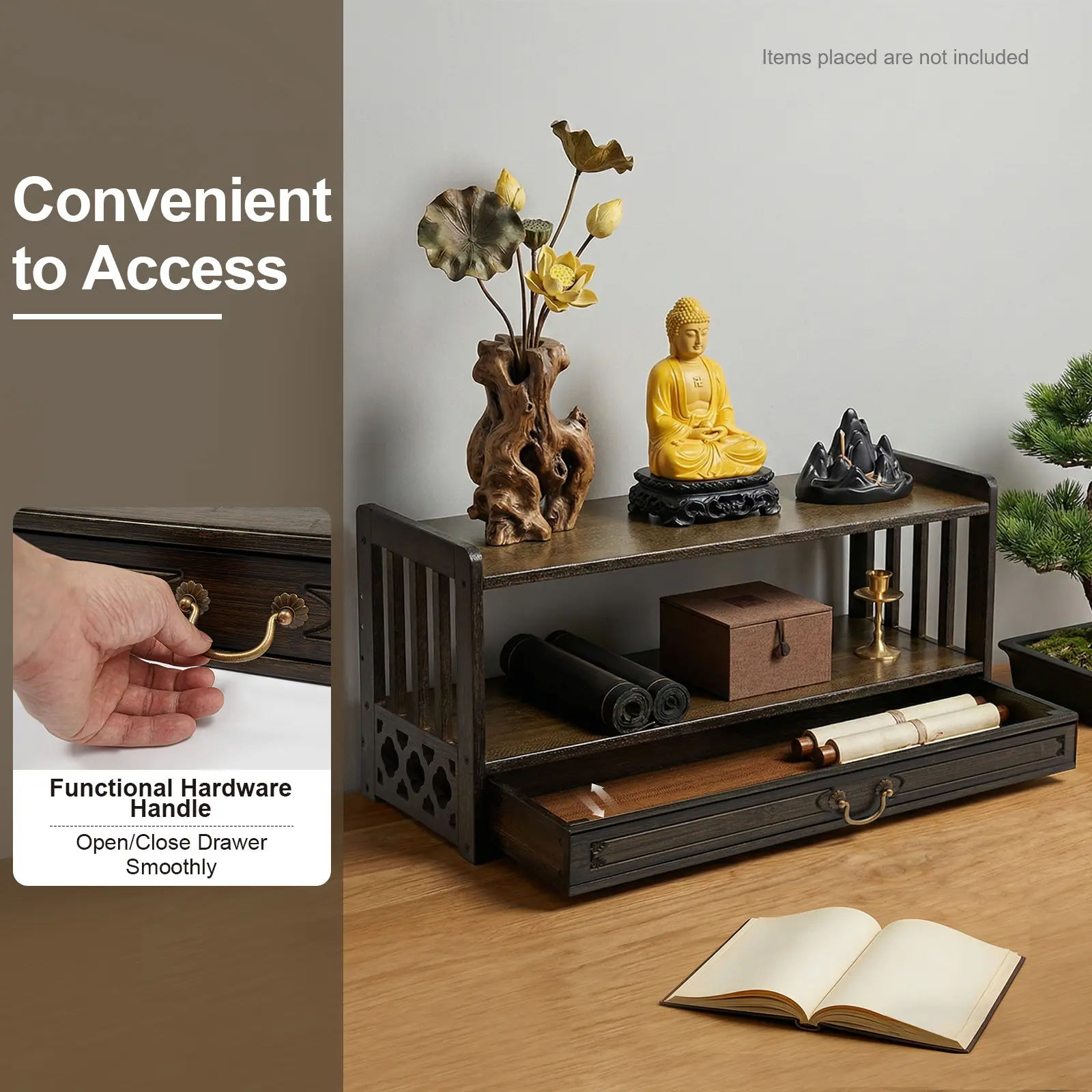 Storage Assistant: It adopts a 3-tier structure. The top tier can hold Buddha statues and meditation bowls, the middle tier can store books and jars, and the bottom drawer can hold candles and other altar supplies.
