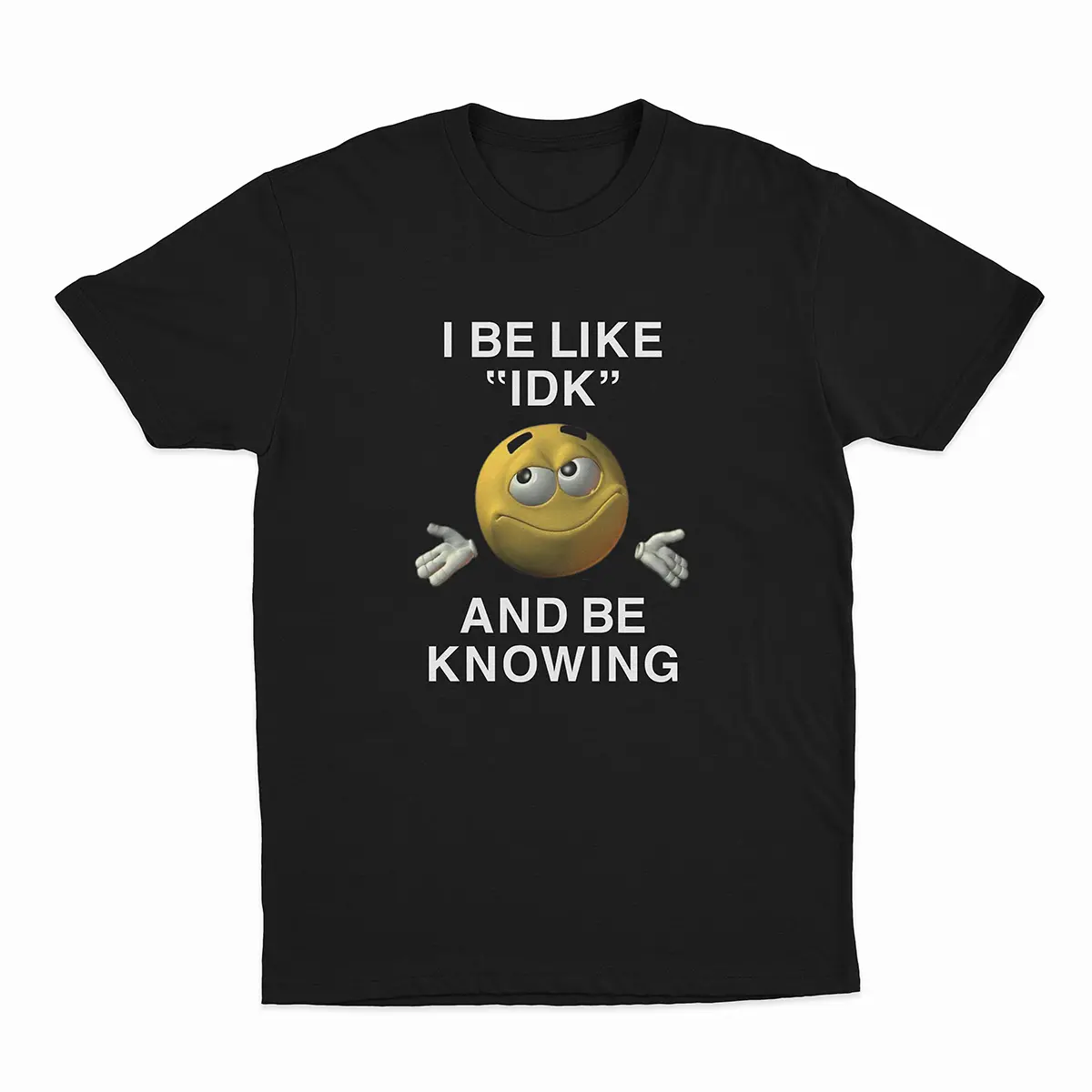 This short sleeve T-shirt features the hilarious and relatable quote "I Be Like 'IDK' and Be Knowing", bringing a fun and playful personality to your everyday look. With a classic crew neck and unisex relaxed fit, it offers a comfortable wearing experience for both men and women, perfect for daily outings, hanging out with friends, school, casual gatherings, street style, and weekend relaxation. The lightweight and smooth fabric ensures great breathability and a soft touch, keeping you comfortable all day long. High-quality printing makes the funny slogan clear and long-lasting, not easy to fade or peel after repeated washing. Its versatile style easily matches with jeans, shorts, casual pants, skirts and light jackets, making it a must-have for anyone who loves humorous, trendy and relatable casual fashion. This eye-catching tee adds humor and character to any outfit, making it ideal for expressing your fun side in daily life.