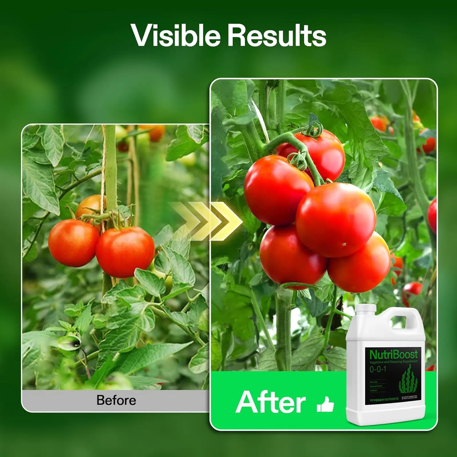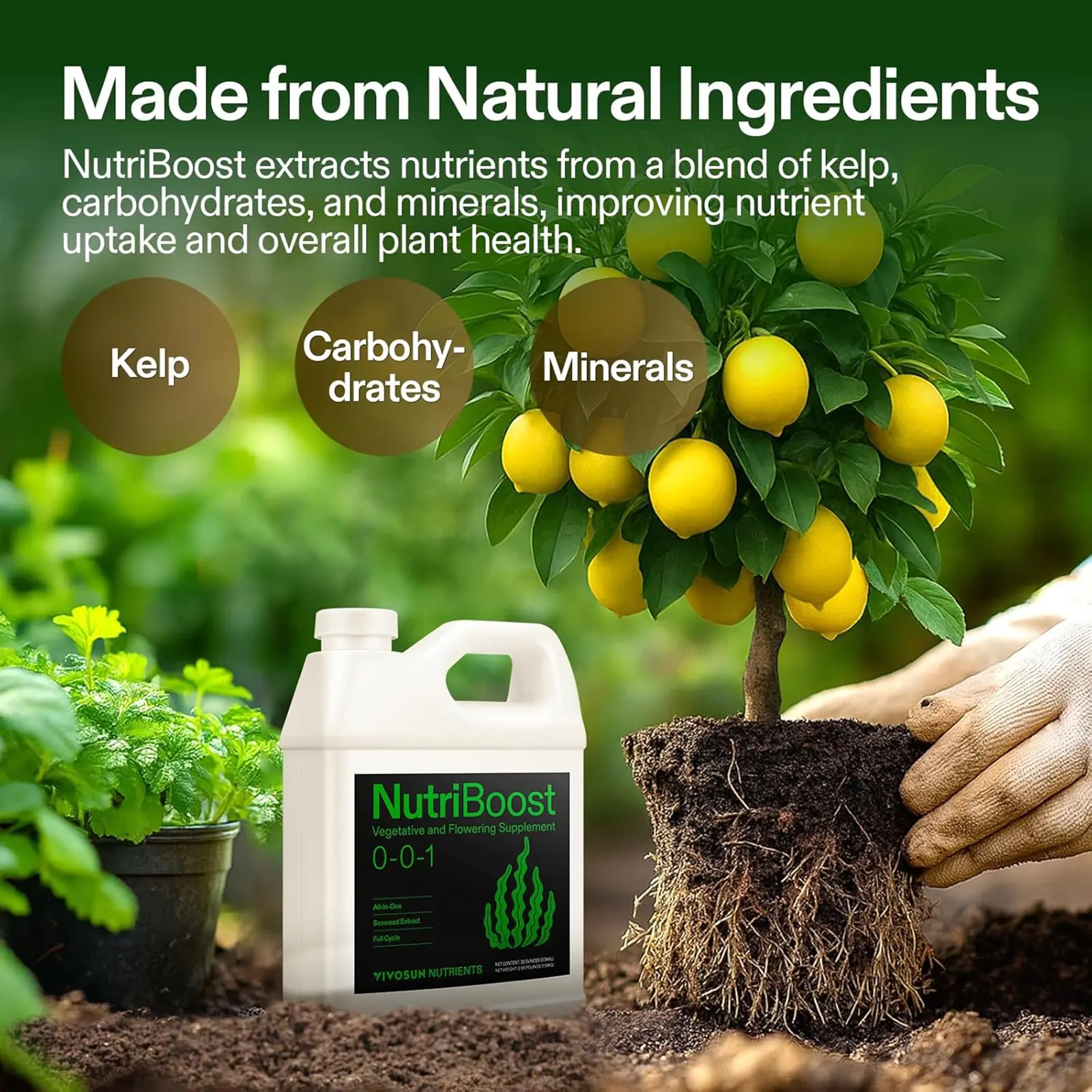 NutriBoost is a premium additive formulated with high-quality ingredients, including natural kelp extract, carbohydrates, and essential minerals; This rich blend provides comprehensive nutrition, promoting vigorous growth at every stage while simplifying your plant nutrient regimen with a single product