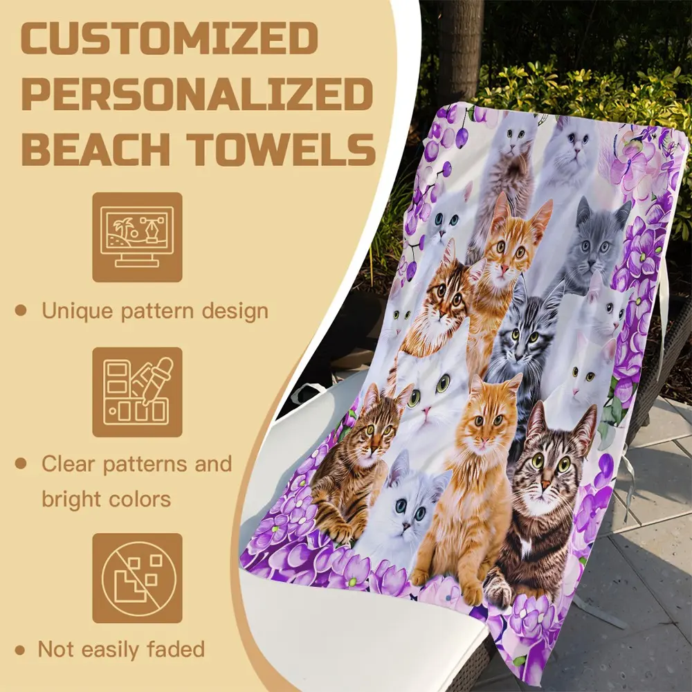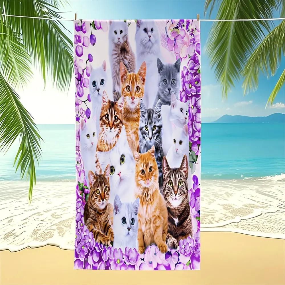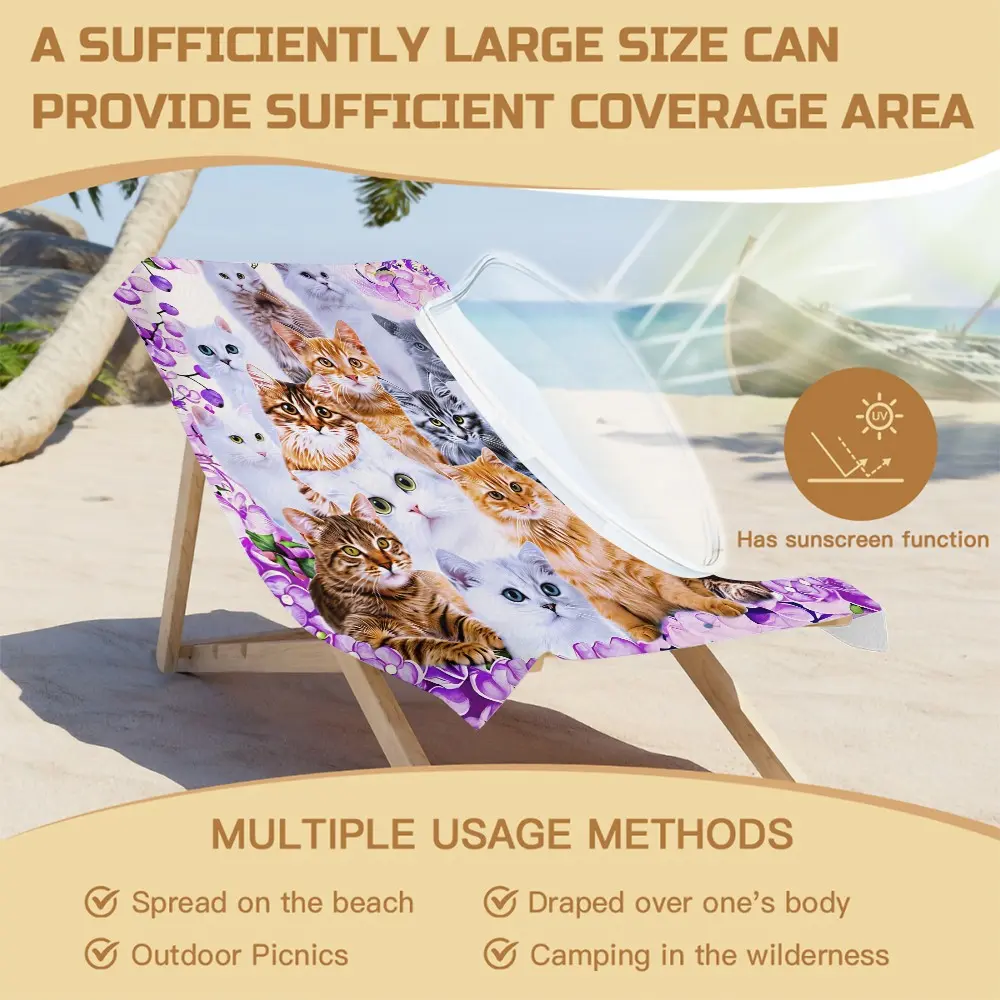 Purple Flower Cats Print Oversized Beach Towel, Soft Microfiber Bath Towel, Sand Free Large Beach Blanket for Summer Vacation, Family Travel Camping Cat Lover Accessory