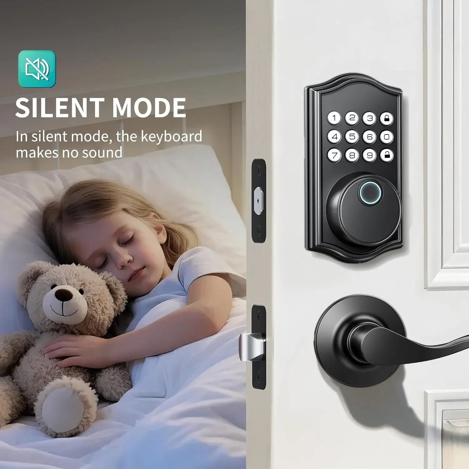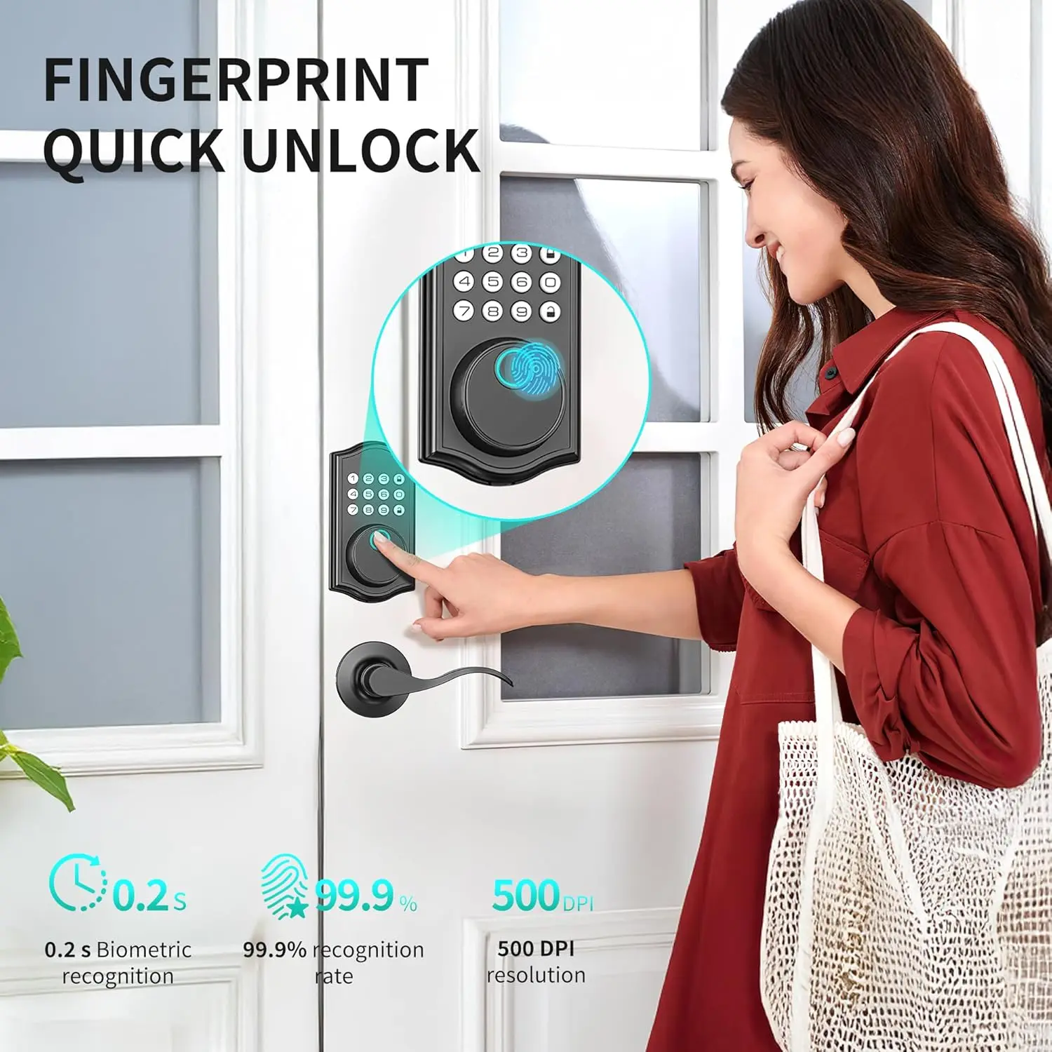 ·Blazing-Fast Fingerprint Unlock,No More Waiting: Fingerprint door lock recognizes your fingerprint in 0.2 seconds and unlocks the door in 1 second, with an ultra-high 99.99% accuracy rate. No more fumbling for keys when your hands are full with grocery bags or a baby—keyless entry door lock make daily entry more efficient.