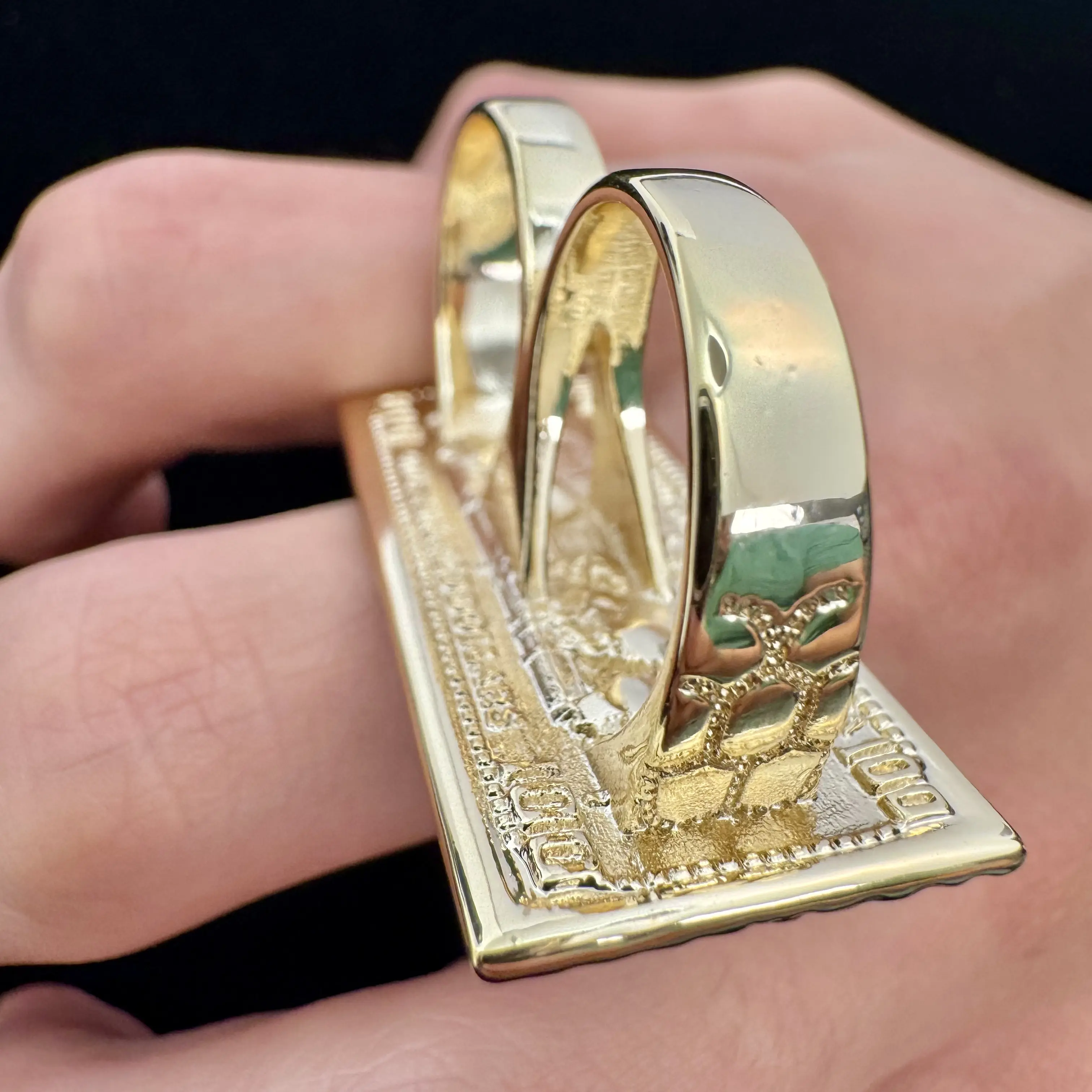 Make your look stand out instantly with this bold gold two-finger statement ring.Designed with an oversized hip hop style, this ring adds a strong fashion attitude to any outfit.Whether you choose the textured bar design or the money-inspired bar design, both styles are made to catch attention and elevate your streetwear, party, or casual look.