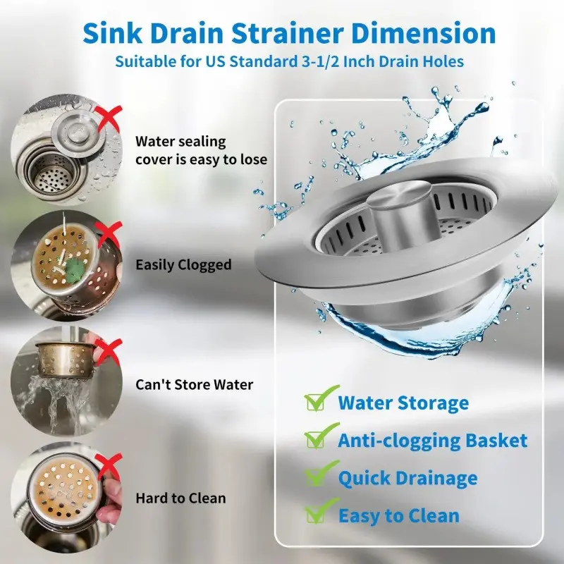5. 2PACK Upgraded 3 in 1 Kitchen Sink Drain Strainer - Stainless Steel Sink Stopper, Anti-Clogging Sink Food Catcher Basket,for US Standard 3 1/2 inch Drain (1)