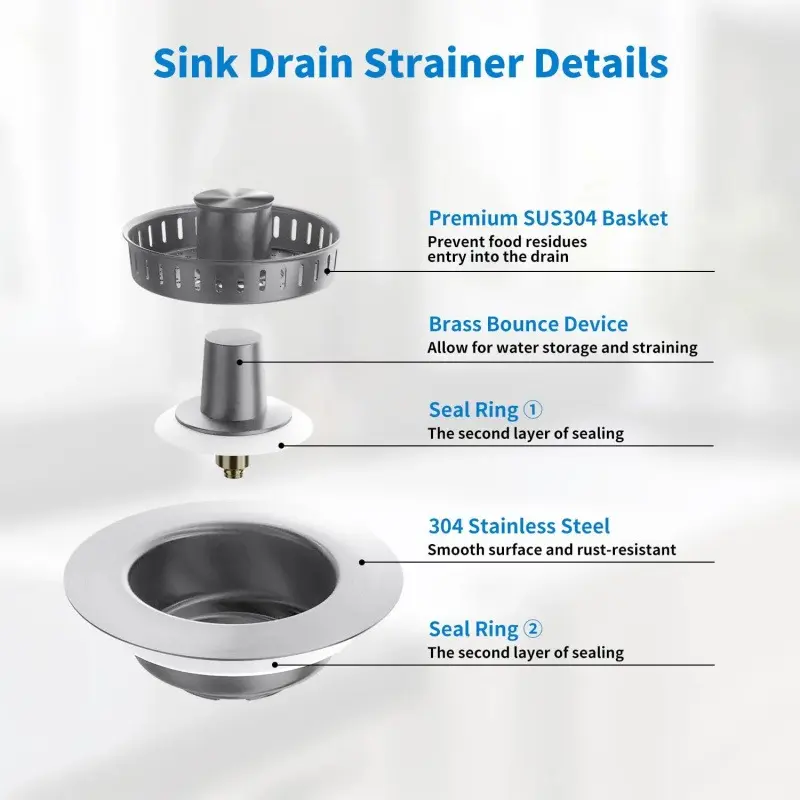 Introducing our 3-in-1 Kitchen Sink Drain Strainer—your all-in-one solution for water storage, filtering, and odor control. Engineered for easy installation and reliable performance, it catches food scraps to prevent clogs, ensuring smooth drainage. Ideal for kitchens, restaurants, and canteens, it’s the ultimate sink upgrade for effortless efficiency.