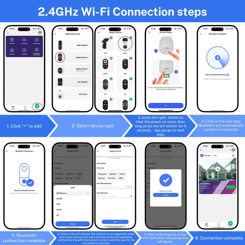 (1) The security camera only works with 2.4GHz Wi-Fi.Please connect it to a 2.4GHz network.