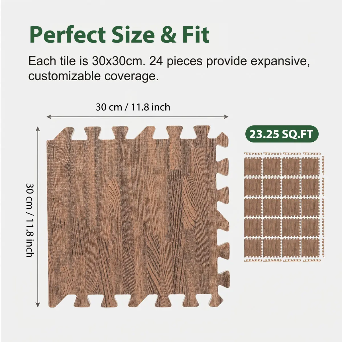 ✨ Wood Grain Interlocking Floor Mat Tiles – Elevate your home or outdoor area with these versatile tiles. Each tile measures 30cm x 30cm (11.8” x 11.8”) and is 1cm (0.39”) thick, providing a comfortable cushion. A set of 24 tiles covers 23.25 sq.ft., offering customizable coverage. Perfect for exercise, playrooms, or home decor, these mats ensure worry-free performance.