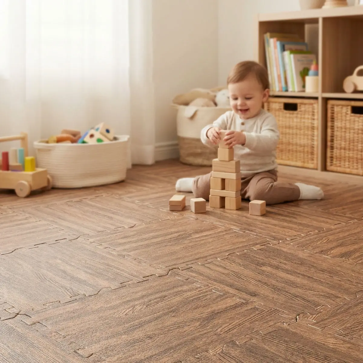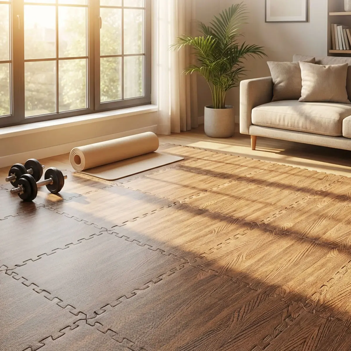🏠 Home Gym / Exercise Area – Cushions joints during yoga. Playroom & Kids’ Area – Safe, soft surface. Room Decor – Stylish wood look. Outdoor Spaces – Clean, comfortable floor. Garage or Workshop – Anti-fatigue standing surface.