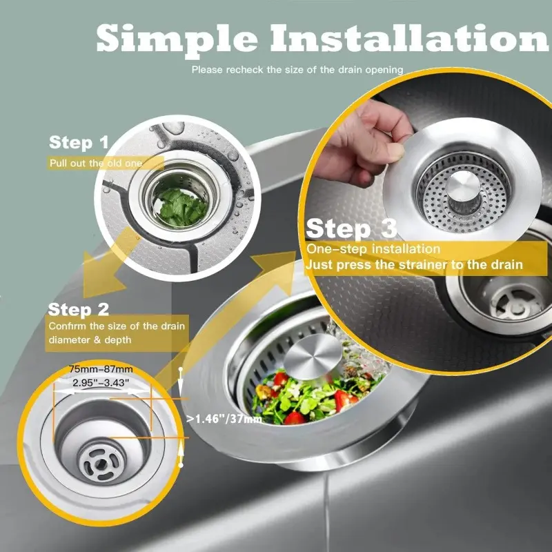 SUS304 Stainless Steel 3 in 1 Kitchen Sink Drain Strainer with Anti-Clogging Basket, Upgraded Spring Design, Easy Installation, Suitable for US Standard 3-1/2" Drain (2)