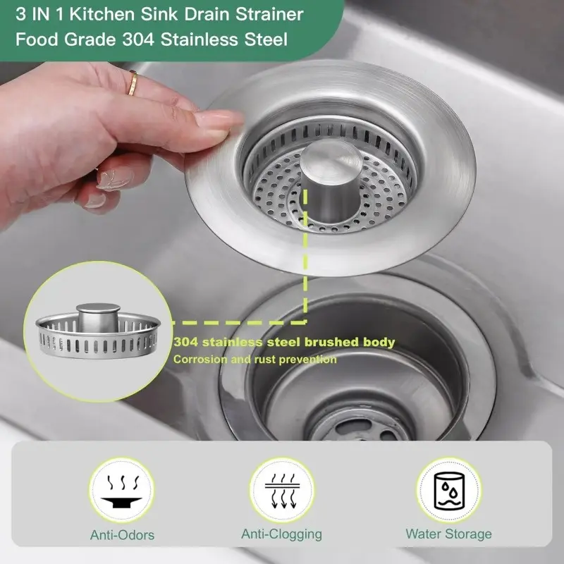 Stainless Steel Kitchen Sink Strainer 3-in-1 Deodorizing Anti-Clogging Basket Strainer for US 3-1/2 Inch Sink Drains