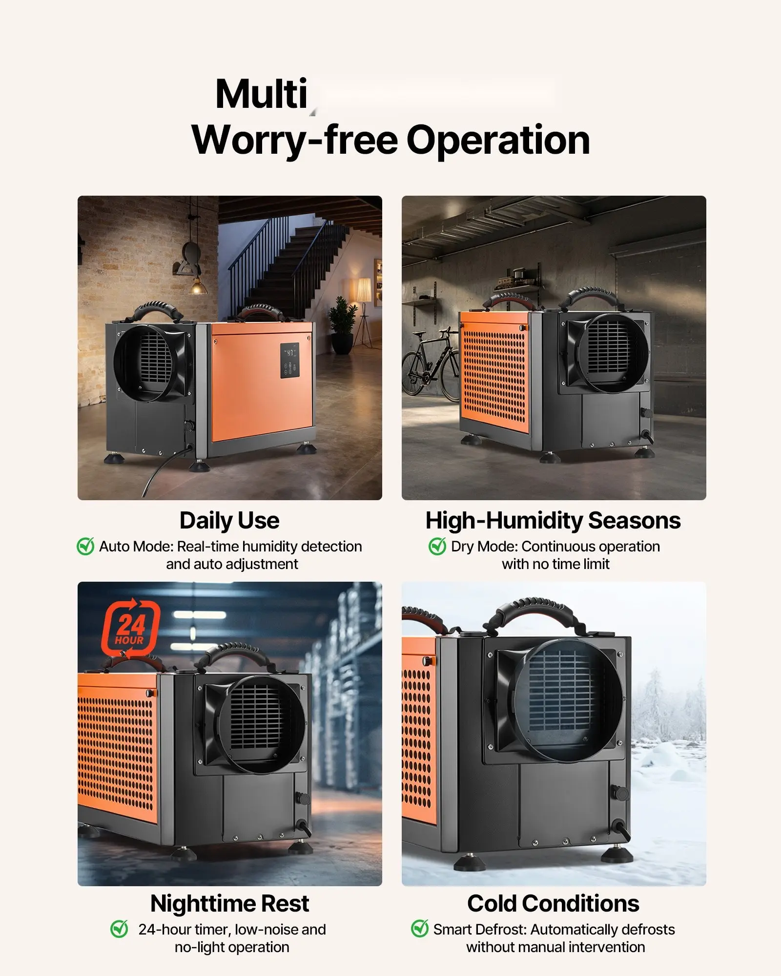 ·Multiple Operating Modes: Offers Auto, Dry, Sleep, and Smart Defrost modes to meet various needs, Choose the right dehumidification setting for any situation, ideal as a shop dehumidifier or for use in homes, basements, and commercial spaces