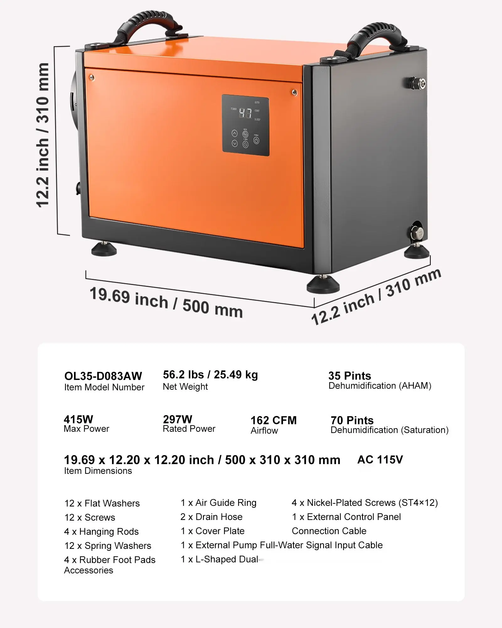 ·Powerful Dehumidification: Equipped with a CSA-certified compressor, this commercial dehumidifier draws out up to 70 pints/day (under saturation conditions), ideal for crawl spaces, basements, or industrial areas up to 1,000 sq. ft