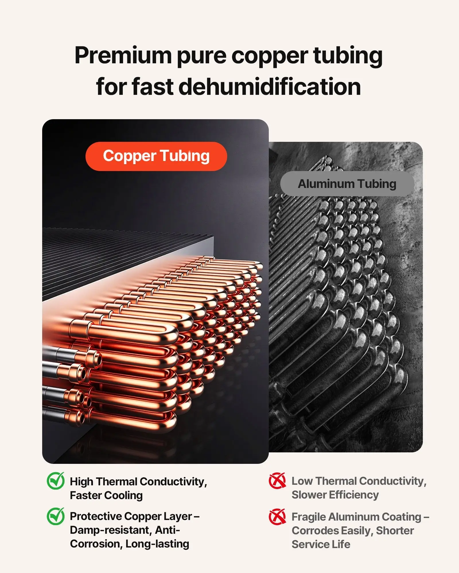 ·Copper Tubing for Cooling: Compared to aluminum, the pure copper condenser in this industrial dehumidifier ensures faster cooling, faster humidity extraction, better corrosion-resistance, and longer service life