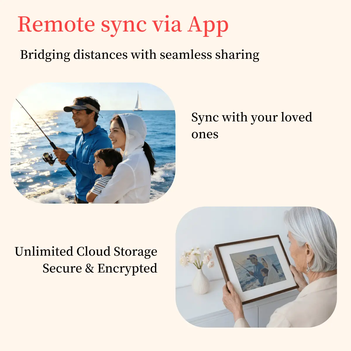 Remote Sharing: Send photos to the frame anytime, anywhere.