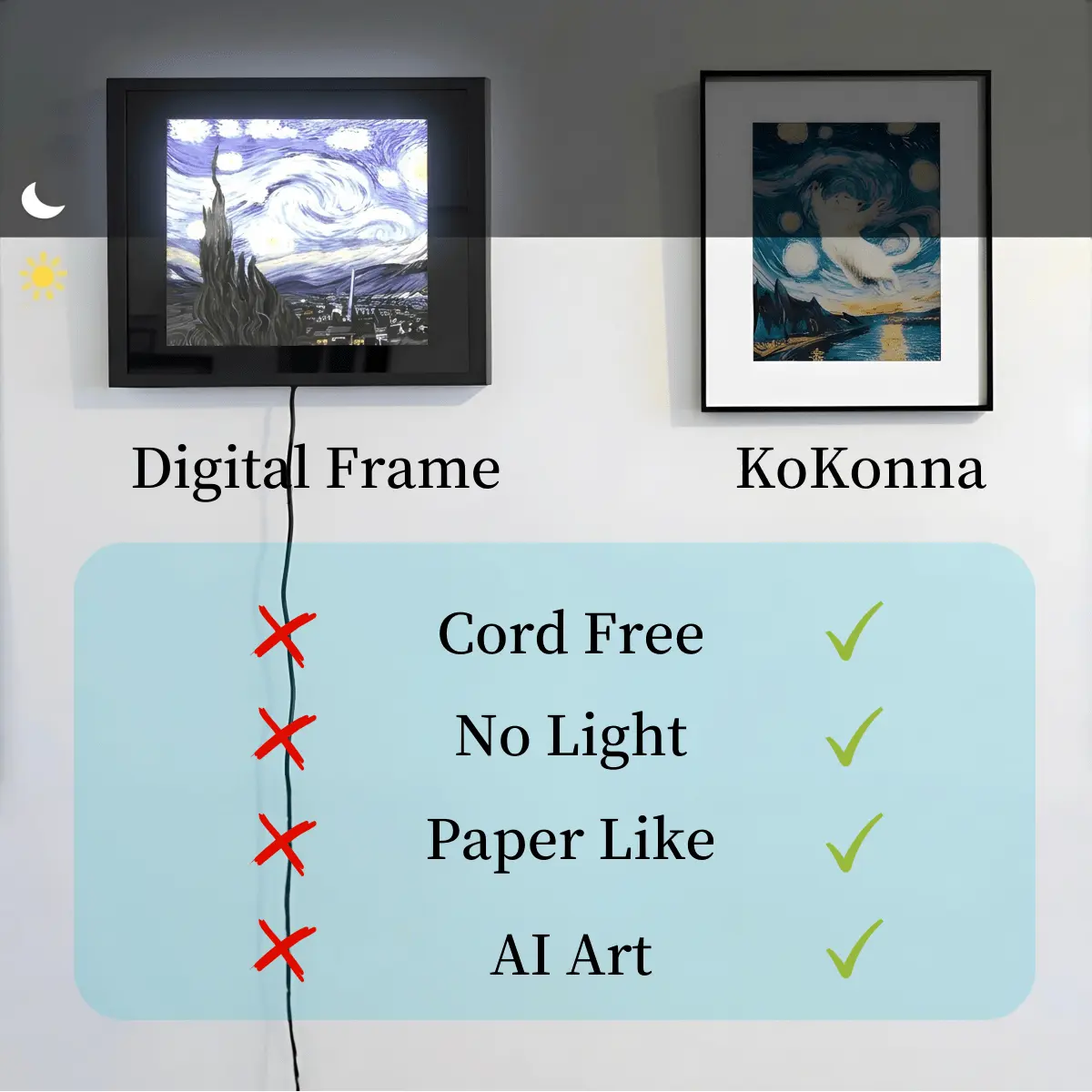 Powered by ultra-low-power E-Ink technology, one charge lasts for months. Free your desk from messy cables. Place it on a bookshelf, nightstand, or officedesk like a piece of fine art print.