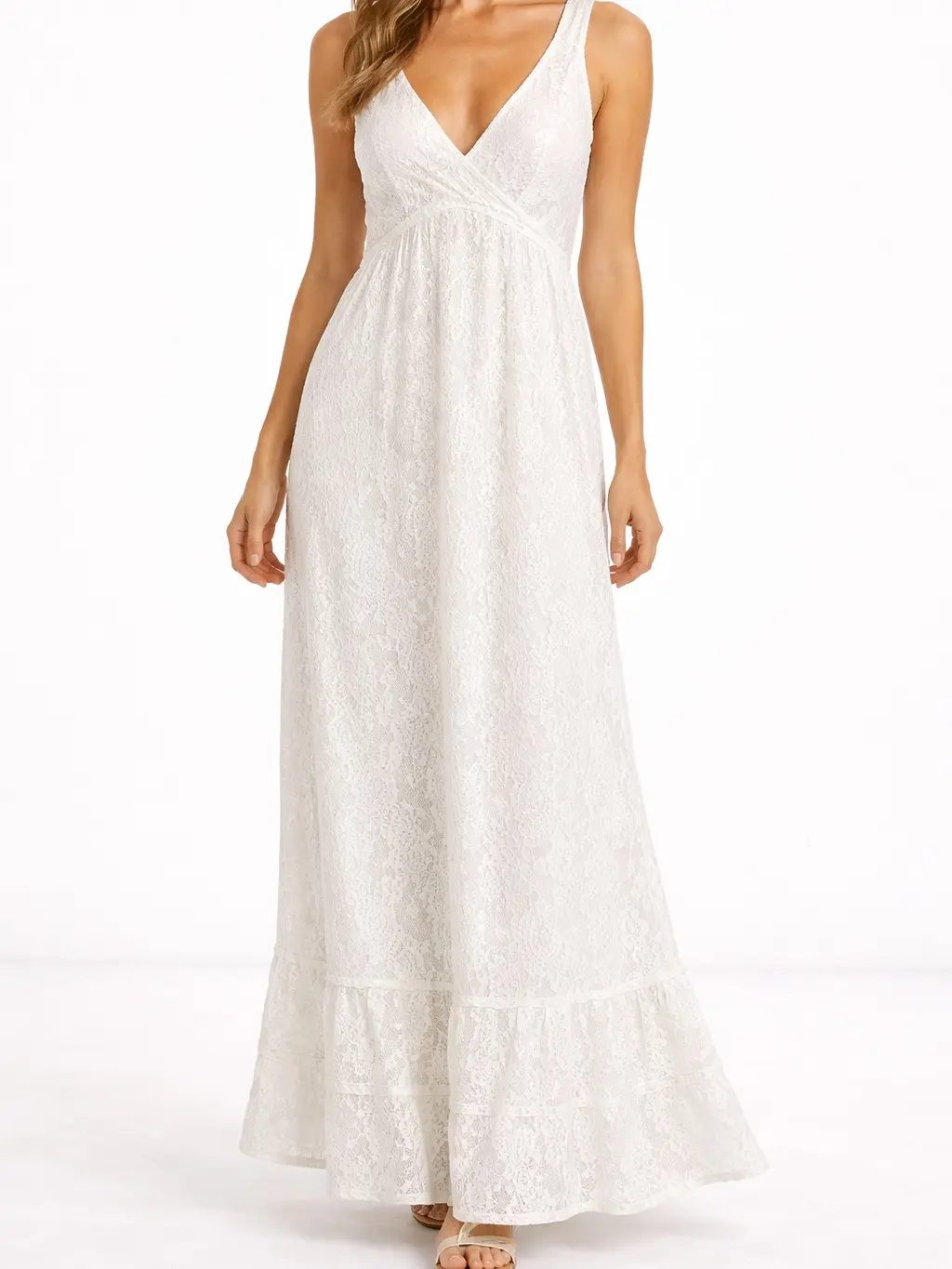 Romantic, soft, and effortlessly feminine, this ivory lace maxi dress brings an elegant airy feel to warm-weather dressing. Designed with a flattering V-neckline, delicate lace texture, wide straps, and a flowing full-length silhouette, it creates a graceful look that feels polished, lightweight, and easy to wear.