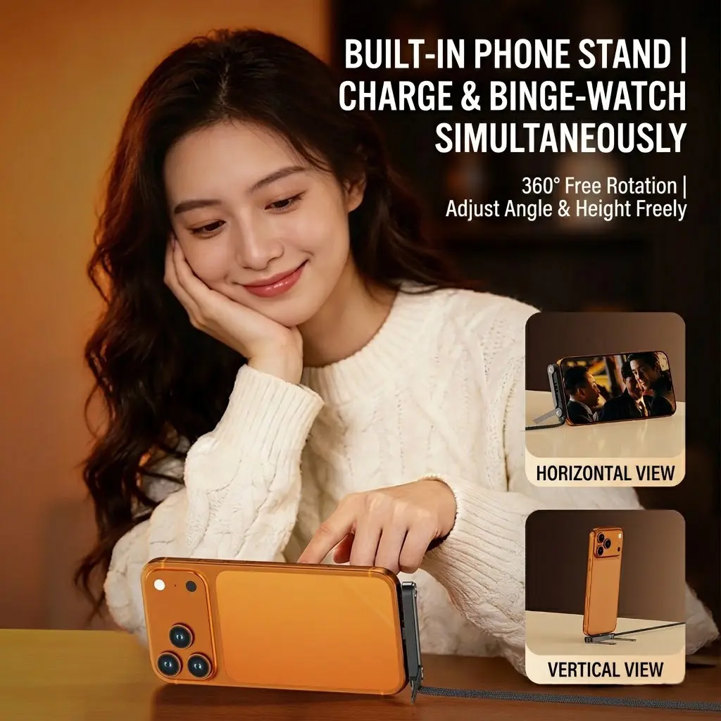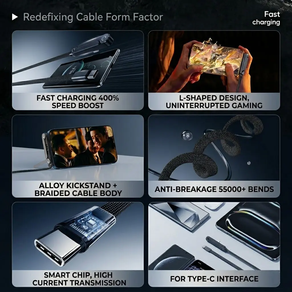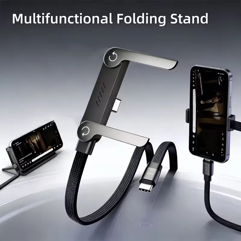 ·Innovative 2-in-1 Design: More than just a cable. The integrated "Invisible" zinc alloy stand transforms into a sturdy phone holder in seconds—perfect for hands-free viewing.