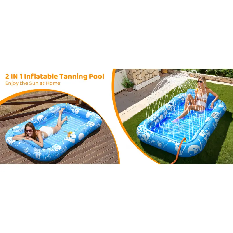 Upgraded Tanning Pool with Water Sprinkler Feature – This inflatable pool now comes with an added water spray function for extra fun and cooling. Just attach a hose to create a light, refreshing spray above the pool. for hot days, it helps keep you cool while you relax or tan. Oversize Design - 77 " long and 48" wide size could hold up to 2 people and maximum capacity 300 lbs. Enjoy your summer tanning along or share sunbath with your friend or family member. 1 Built in Cup Holders - Keep your favorite drinks close by while you soak up the sun. Comfortable Pillow & Air Cushion Base - Our Tanning Pool is built with a removable pillow and ribbed air cushion base. The pillow provides your neck and back additional support, and the ribbed air cushion base provides you extra comfort lounging sun tanning experience. All in One Pool - This Tanning Lounge is made of thick, heavy-duty and UV resistant PVC with thickness up to 0. 3mm. Functions as a tanning mat, personal pool, pool float, lake float, and even a ball pit! for swimming pool parties, beach, lake, river, backyard,allowing you to enjoy sunbathing to the fullest. Fill Water and Keep Cool - Fill the sun bathing tub with water, lay out and tan on the water without getting overheated. Enjoy a sunbath and relax. Enjoy with your friends, family members and lovers to have a outdoor summer pool party.