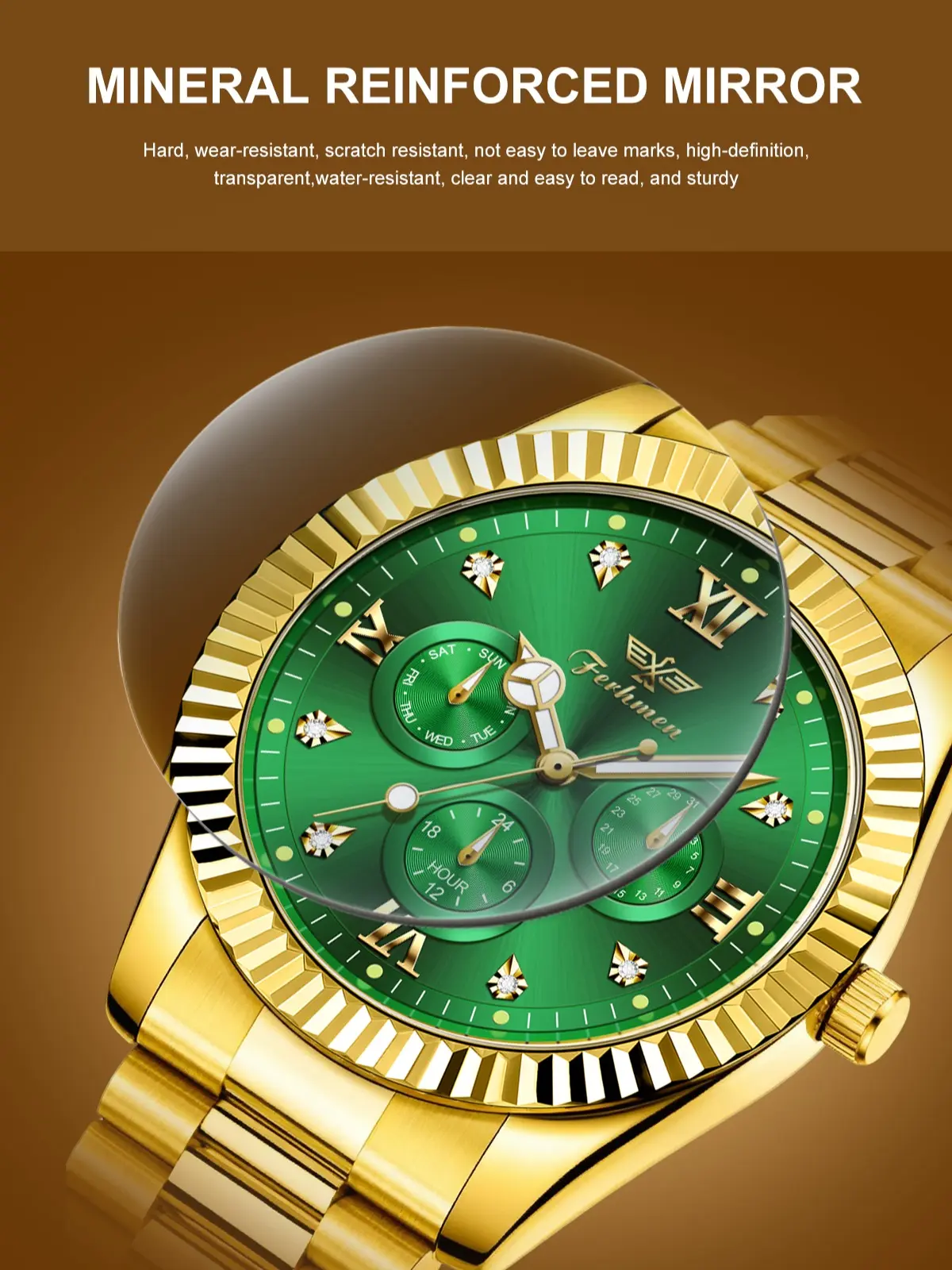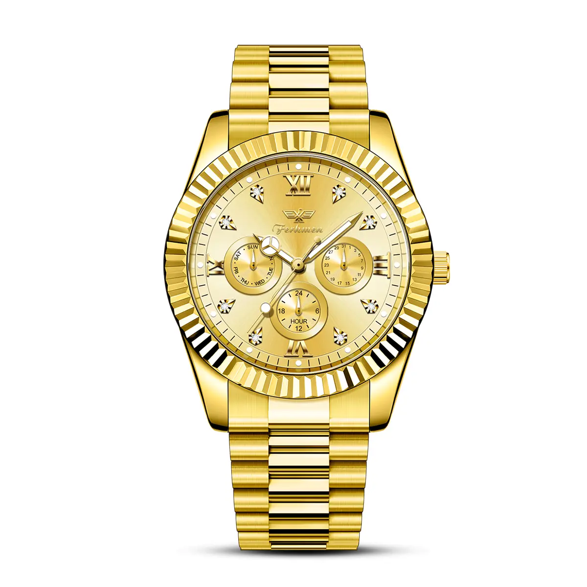 Elevate your style with the Ferhmen Men's Luxury Dress Watch. This 41mm watch features a gold dial and a stainless steel band, perfect for any occasion. The rotating quartz analog ensures precise timekeeping. Ideal as an anniversary gift, it combines elegance with functionality.