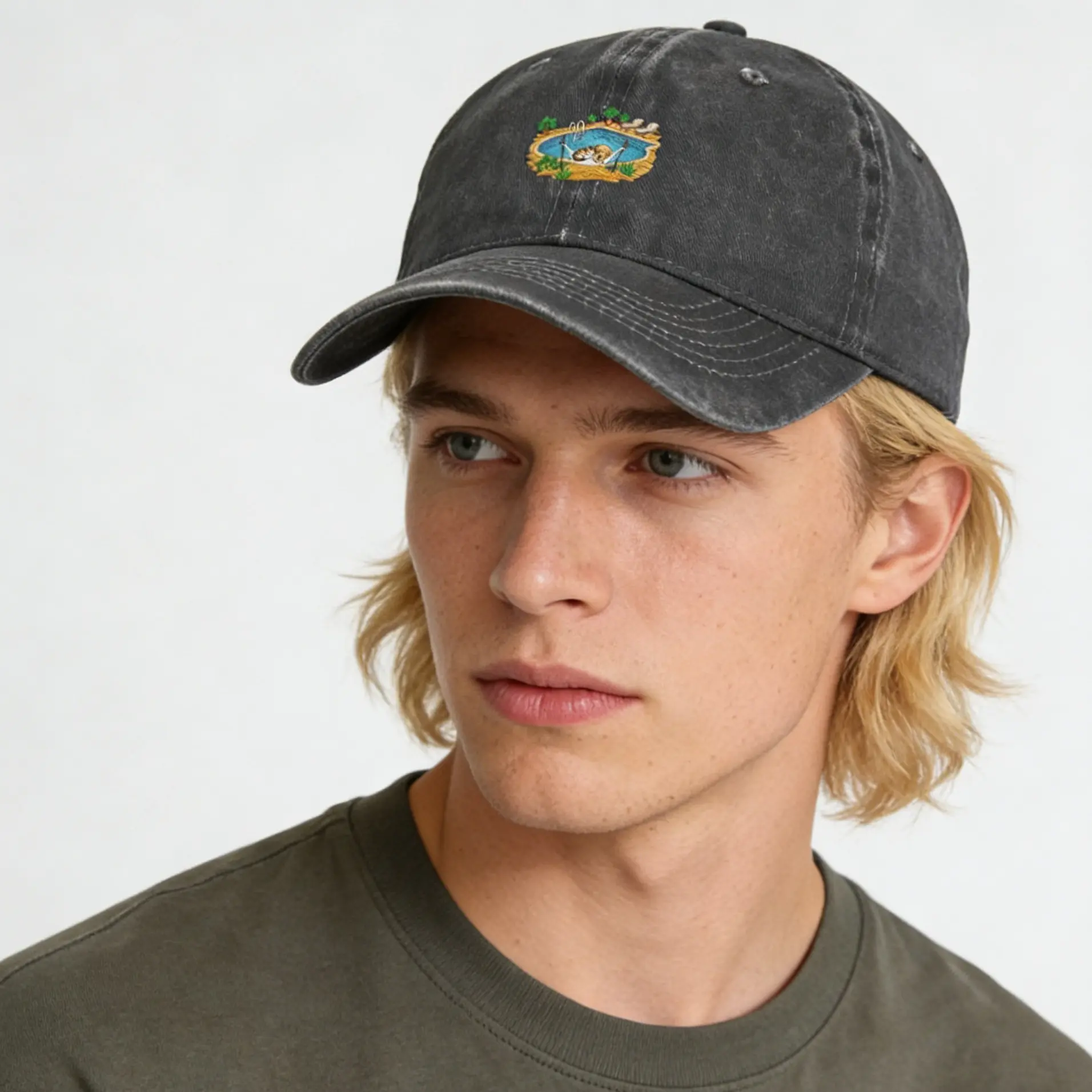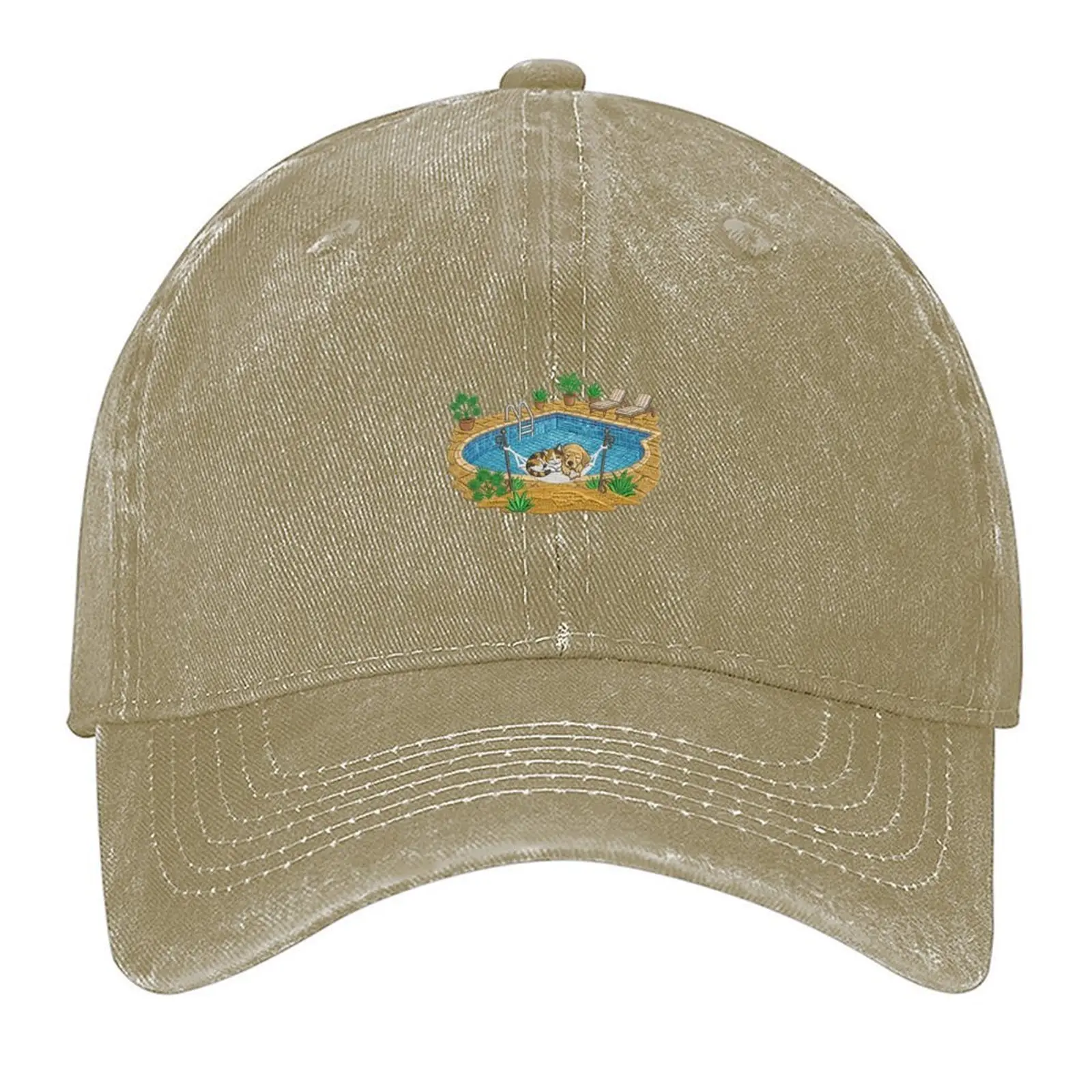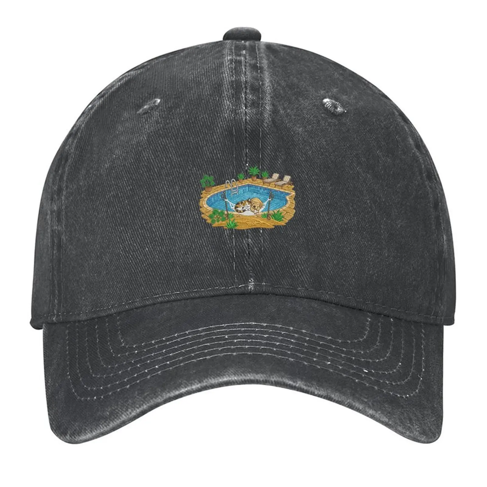 Ready to switch to "Do Not Disturb"? This faded black dad hat is your ultimate mood board. Featuring a hilariously cute dog and cat chilling in a hammock over a pool, it's the perfect blend of vintage aesthetic and laid-back humor.