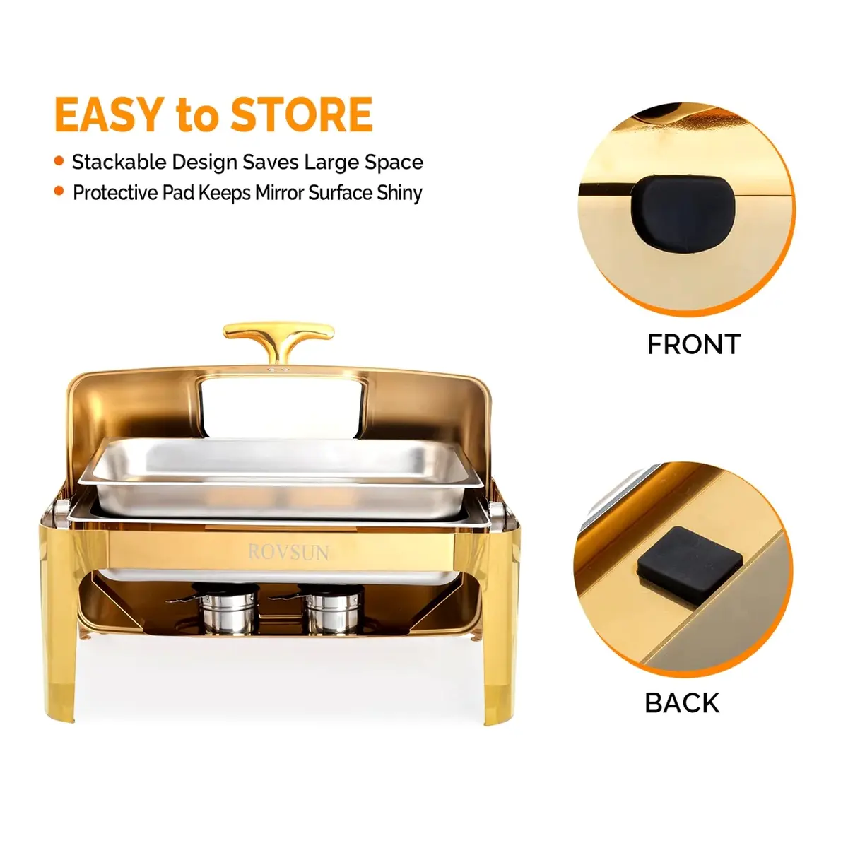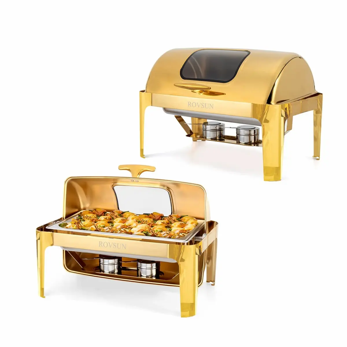 Designed for versatility and style, the ROVSUN 9 QT Gold Roll Top Chafing Dish Set is the perfect addition to any wedding, banquet, or brunch service. The food-grade stainless steel body is NSF-certified, ensuring safety while providing resistance to corrosion and extreme temperatures. Its sophisticated gold finish offers a luxurious look that transitions flawlessly from the kitchen to the dining area. Guests will appreciate the smooth-gliding roll-top cover, which stays open at either 90° or 180° for convenient access. Two fuel holders at the base ensure food stays at the perfect serving temperature, while the water pan offers a cooling option when filled with ice.