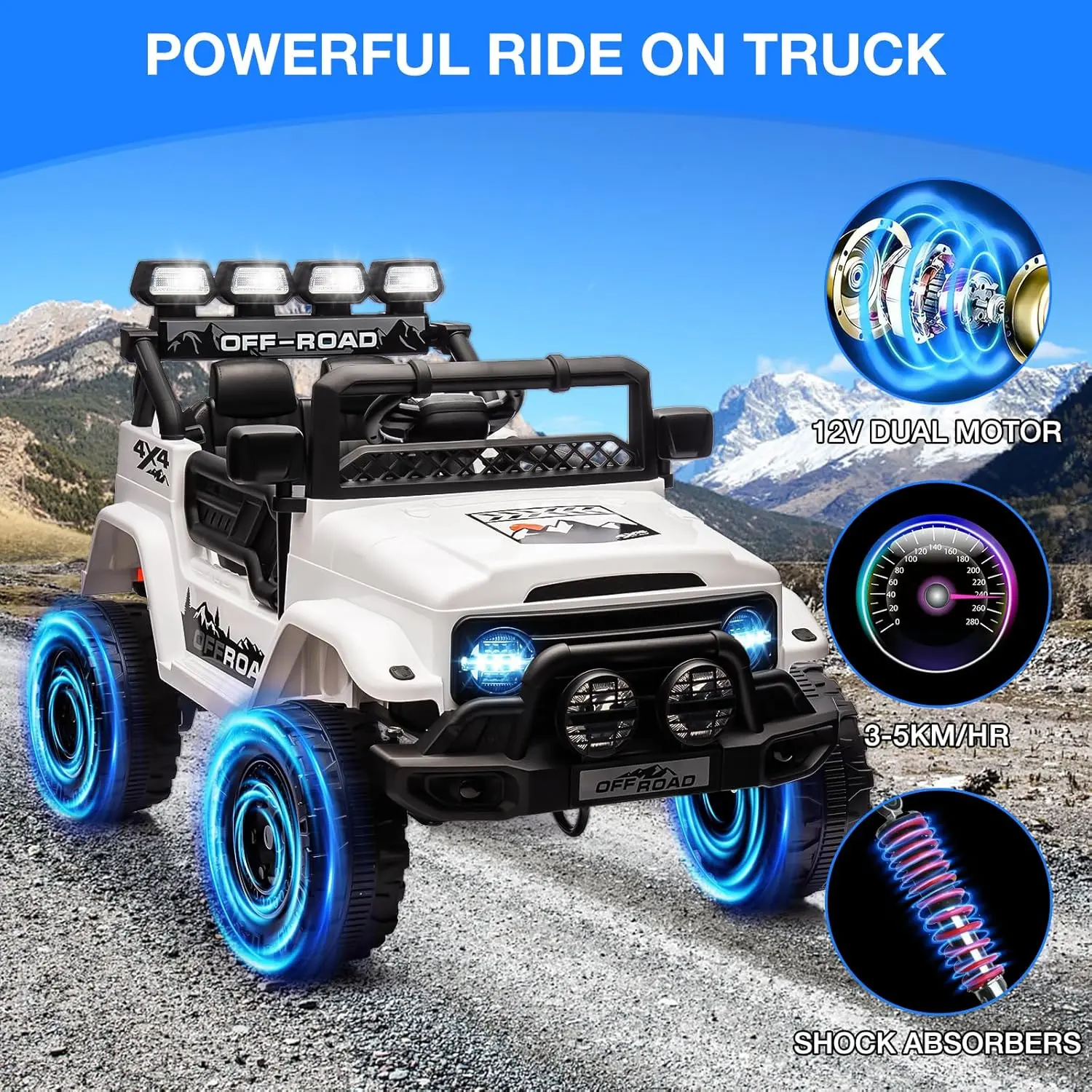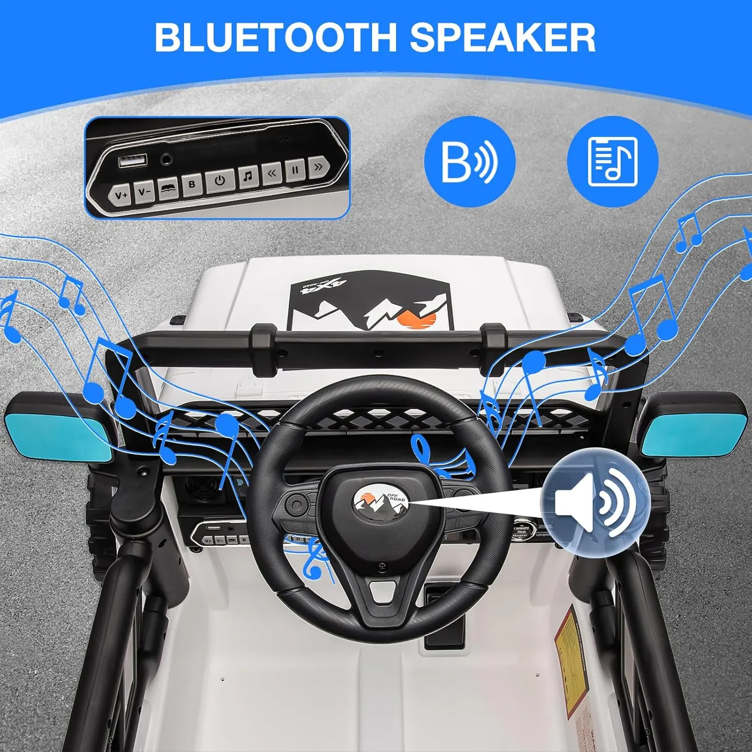 ·[Multifunctional Kids Car] Easy to start with one key. The electric truck features Bluetooth speaker, horn, MP3, AUX outlet. It can play stories or music, thanks to the AUX function, parents can also connect phones to select music for their kids’ preferences.