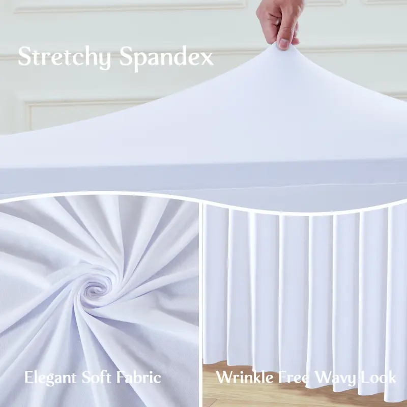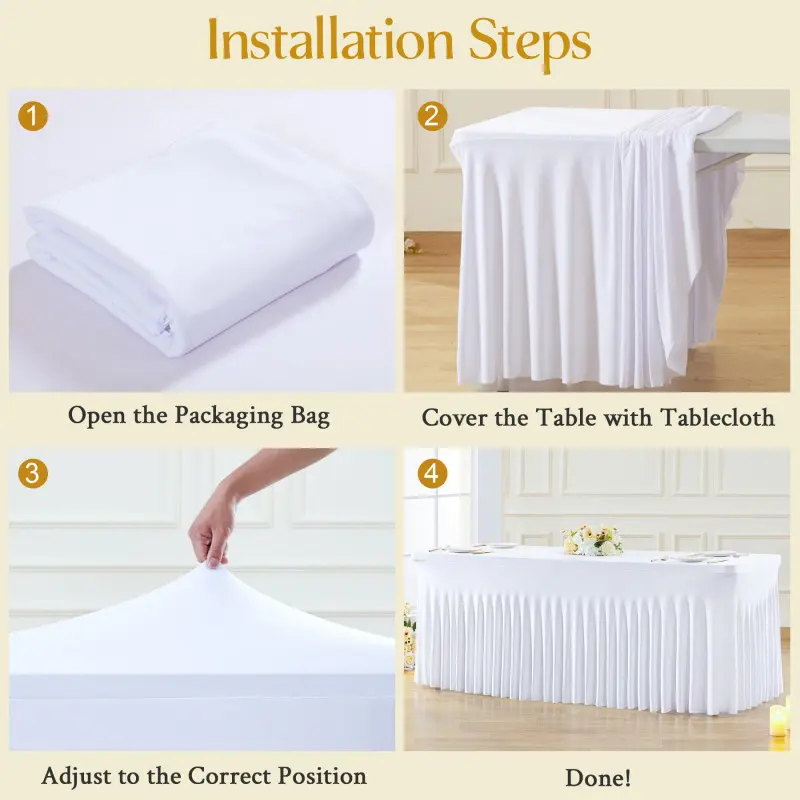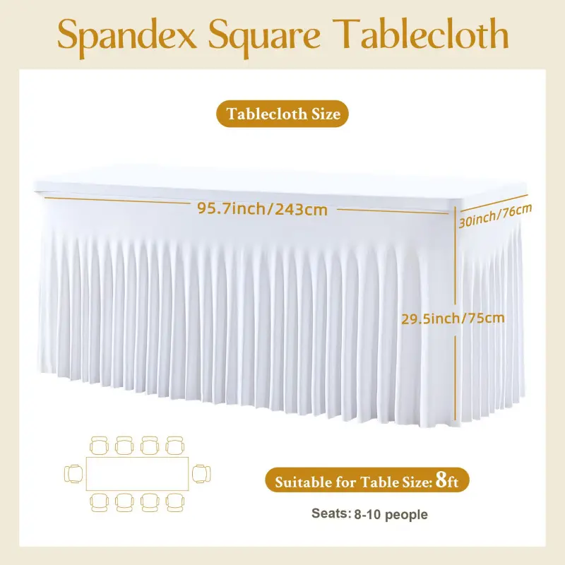 Included Components:tableclothPlace:prayer roomInstallment:Floor mountHoliday/Occasion:weddingManufacturer:ChinaMaterial:spandexShape:SquareTheme:weddingStyle:ClassicOccasion:Wedding,Anniversary,Birthday,Party,Shower,Housewarming,New Years EveBatteries Included:NoQuantity Per Pack:1Stretchy White Spandex Table Cover for 4/6/8 Foot Rectangle Tables. 4 ft:48 in * 23. 6 in * 29 in6 ft:72 in * 29 in * 29 in8 ft:95. 7 in 30 in 29. 5 inWavy Spandex Tablecloths with Skirt Ruffles Add Elegance, fabric tablecloths for partiesIt fit perfectly and is hiding all the items under the table that needed to be hidden, keep boxes and back stock from being visible. Fits on a standard 4/6/8 foot table. The table cloth is a one piece-fit, it was very easy to place over the top of the table. White Table Clothes with skirt for 4/6/8 foot Rectangle Tables. The elastic top molded snugly around the table. Made of stretchy fabric: Spandex table cloth skirt. Washing instructions:Machine Wash. Care instructions: Can be ironed to steam out the wrinkles. Please do not turn iron too hot. Stretchy table cover tablecloths for 4/6/8 foot rectangle tables for home decorations. The bottom of the pleats hung close to the floor. Adds elegance to tables: this stretchy table cover shows pleats to make your cake table look fancier. Easy to Install & Save Time: You can set up this stretchy tablecloths by yourself. It is an amazing time saver. elegant white fitted table clothes to decor your tables. Wide Application for this White Spandex Tablecloths. Ruffles Add Elegance. The long, beautiful ruffles design of the stretch spandex tablecloths will razzle-dazzle party guests and turn any table into a total showstopper. Elegant table clothes for Any Parties or Events - Wrinkles free material makes the table clothes looks fantastic, fit to decorate wedding reception tables, party tables, birthday or shower tables, vendor display tables, banquet tables, Sunday school class room table, or any party and events tables. Included Components:tableclothPlace:prayer roomInstallment:Floor mountHoliday/Occasion:weddingManufacturer:ChinaMaterial:spandexShape:SquareTheme:weddingStyle:ClassicOccasion:Wedding,Anniversary,Birthday,Party,Shower,Housewarming,New Years EveBatteries Included:NoQuantity Per Pack:1Stretchy White Spandex Table Cover for 4/6/8 Foot Rectangle Tables. 4 ft:48 in * 23. 6 in * 29 in6 ft:72 in * 29 in * 29 in8 ft:95. 7 in 30 in 29. 5 inWavy Spandex Tablecloths with Skirt Ruffles Add Elegance, fabric tablecloths for partiesIt fit perfectly and is hiding all the items under the table that needed to be hidden, keep boxes and back stock from being visible. Fits on a standard 4/6/8 foot table. The table cloth is a one piece-fit, it was very easy to place over the top of the table. White Table Clothes with skirt for 4/6/8 foot Rectangle Tables. The elastic top molded snugly around the table. Made of stretchy fabric: Spandex table cloth skirt. Washing instructions:Machine Wash. Care instructions: Can be ironed to steam out the wrinkles. Please do not turn iron too hot. Stretchy table cover tablecloths for 4/6/8 foot rectangle tables for home decorations. The bottom of the pleats hung close to the floor. Adds elegance to tables: this stretchy table cover shows pleats to make your cake table look fancier. Easy to Install & Save Time: You can set up this stretchy tablecloths by yourself. It is an amazing time saver. elegant white fitted table clothes to decor your tables. Wide Application for this White Spandex Tablecloths. Ruffles Add Elegance. The long, beautiful ruffles design of the stretch spandex tablecloths will razzle-dazzle party guests and turn any table into a total showstopper. Elegant table clothes for Any Parties or Events - Wrinkles free material makes the table clothes looks fantastic, fit to decorate wedding reception tables, party tables, birthday or shower tables, vendor display tables, banquet tables, Sunday school class room table, or any party and events tables. Included Components:tableclothPlace:prayer roomInstallment:Floor mountHoliday/Occasion:weddingManufacturer:ChinaMaterial:spandexShape:SquareTheme:weddingStyle:ClassicOccasion:Wedding,Anniversary,Birthday,Party,Shower,Housewarming,New Years EveBatteries Included:NoQuantity Per Pack:1Stretchy White Spandex Table Cover for 4/6/8 Foot Rectangle Tables. 4 ft:48 in * 23. 6 in * 29 in6 ft:72 in * 29 in * 29 in8 ft:95. 7 in 30 in 29. 5 inWavy Spandex Tablecloths with Skirt Ruffles Add Elegance, fabric tablecloths for partiesIt fit perfectly and is hiding all the items under the table that needed to be hidden, keep boxes and back stock from being visible. Fits on a standard 4/6/8 foot table. The table cloth is a one piece-fit, it was very easy to place over the top of the table. White Table Clothes with skirt for 4/6/8 foot Rectangle Tables. The elastic top molded snugly around the table. Made of stretchy fabric: Spandex table cloth skirt. Washing instructions:Machine Wash. Care instructions: Can be ironed to steam out the wrinkles. Please do not turn iron too hot. Stretchy table cover tablecloths for 4/6/8 foot rectangle tables for home decorations. The bottom of the pleats hung close to the floor. Adds elegance to tables: this stretchy table cover shows pleats to make your cake table look fancier. Easy to Install & Save Time: You can set up this stretchy tablecloths by yourself. It is an amazing time saver. elegant white fitted table clothes to decor your tables. Wide Application for this White Spandex Tablecloths. Ruffles Add Elegance. The long, beautiful ruffles design of the stretch spandex tablecloths will razzle-dazzle party guests and turn any table into a total showstopper. Elegant table clothes for Any Parties or Events - Wrinkles free material makes the table clothes looks fantastic, fit to decorate wedding reception tables, party tables, birthday or shower tables, vendor display tables, banquet tables, Sunday school class room table, or any party and events