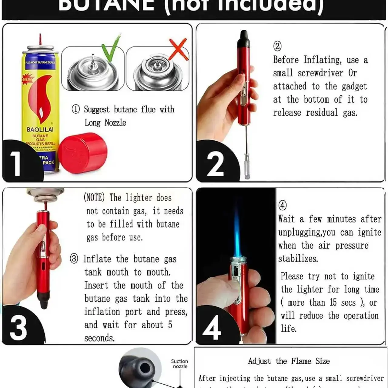 Butane gas NOT included. Lighters are shipped empty due to shipping regulations. Please refill with butane before use.