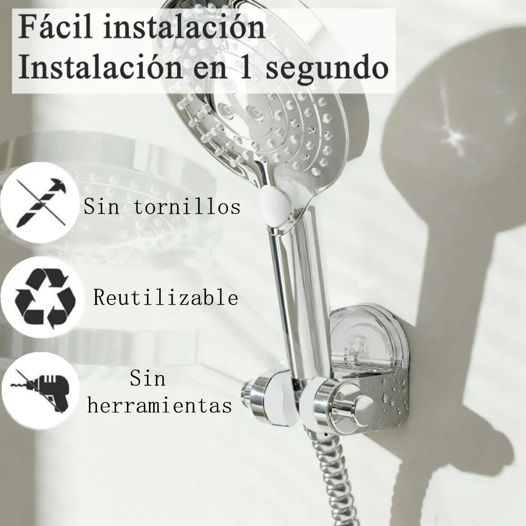 1.Instalación sin Perforaciones: Este soporte para cabezal de ducha no requiere taladrar, lo que facilita su instalación en paredes lisas. Es perfecto para quienes buscan una solución sencilla y sin complicaciones. ️
