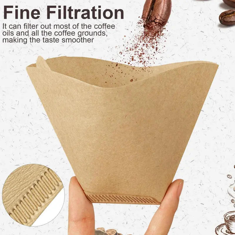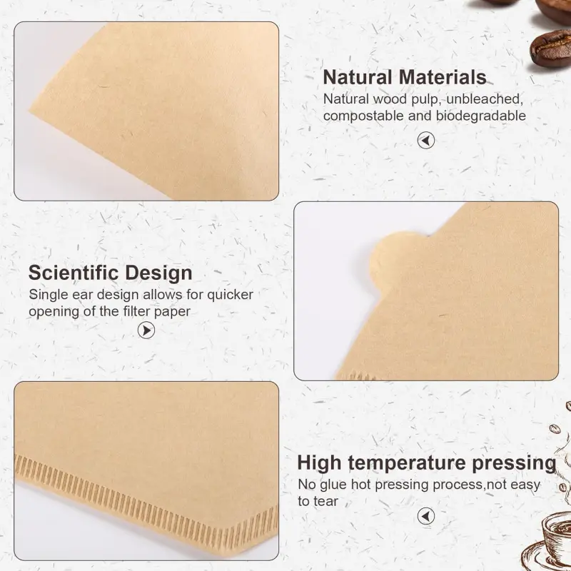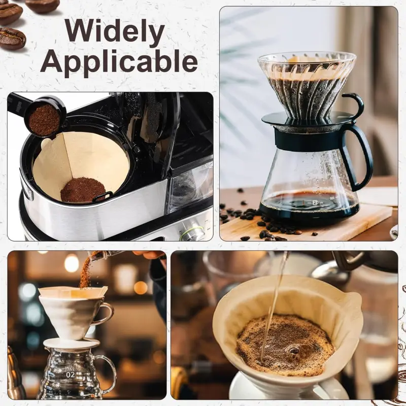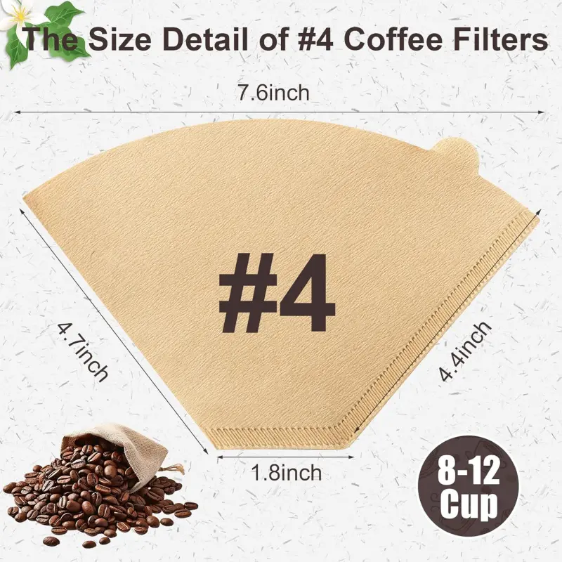 Package Included: Coffee filter paper size is as shown in the picture, please confirm the size before purchasing.240Pcs unbleached # 4 coffee filter papers, which are enough for your useUsage Tips: Fold the coffee filter before placing it in the filter cup, soak the filter in hot water before adding coffee grounds to ensure a smoother fit and even extraction of every part of the groundsCapacity: 4 coffee filter has a capacity of 8-12 cups and is suitable for filter cups, pour-over coffee machines or American coffee machines that require No.4 coffee filters. It is compatible with Ninja filter paper, drip coffee machines and pour-over coffee machinesProduct Material: Coffee filter is made from pure virgin wood pulp and processed through a special process, offering excellent tear resistance, removing coffee oils and grounds, and improving extraction uniformityDesign: Specially developed for hand-poured coffee, the creases on the bottom and sides guide the water flow path, perfectly fit the conical filter cup structure, and the moderate thickness balances the filtration speed and fine powder interception ability to avoid over-extraction or clogging