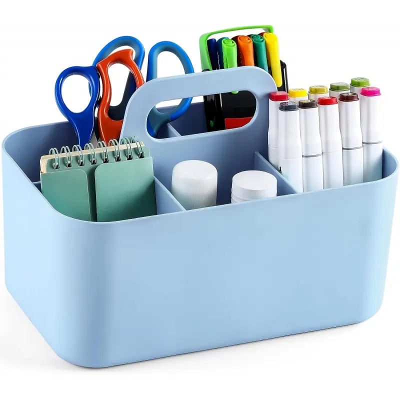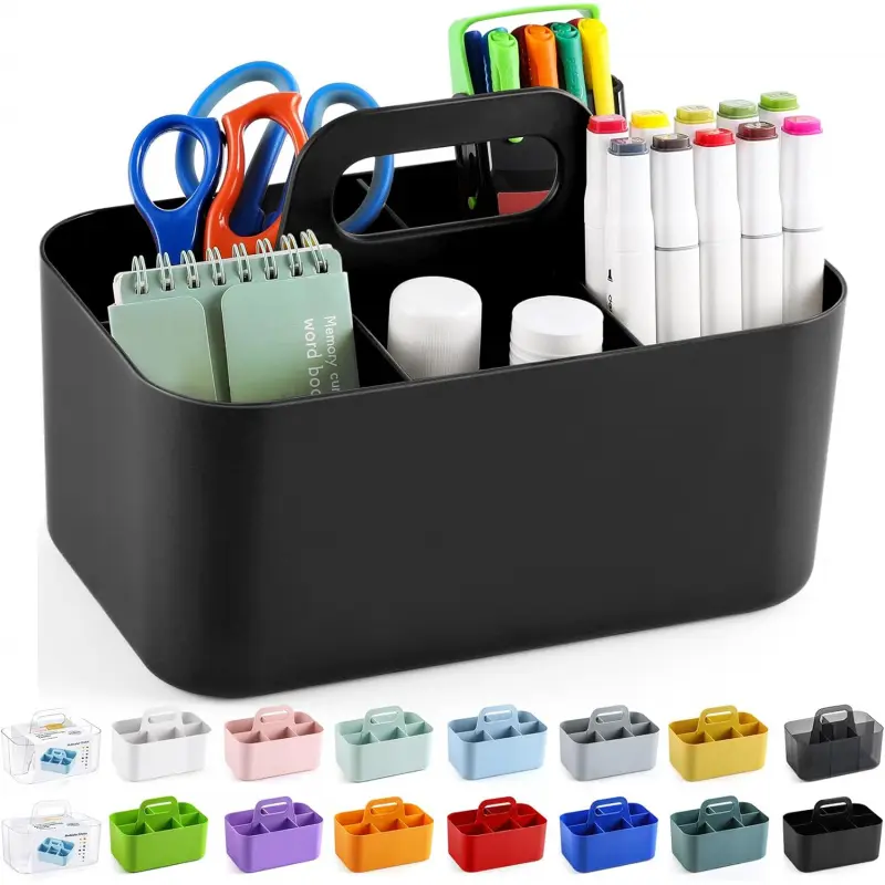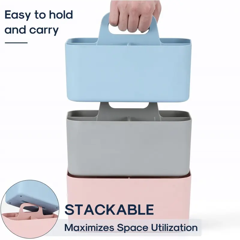 Dimensions: Length 9.8inch x Width 6.1inch x Height 4.4inch (including handle height 6.8inch ). This rectangular partitioned storage rack features rounded corners and comes with through handles. The 5 compartments allow for neat storage of various items, making it especially suitable for storing small items. Additionally, it allows some items to be placed separately, which is both aesthetically pleasing and practicalThis multi-purpose trash can is made of high-quality and durable food-grade BPA-free material. It cannot be washed in the dishwasherThe handle is just the right size and feels comfortable to hold. The handle of one box can overlap with the bottom of another box for stable stackingOne of the dividers is detachable. After removing the divider, the box can be divided into four compartments. The larger compartment can hold items like books, masks, calculators, and other wider itemsMaximize Space for Placing Dressing Tables, Bathroom Countertops, Bath Supplies, Cabinets, Cleaning Supplies, Kitchen Supplies, Silverware, Tableware, Refrigerators, Pantries, Medicines, Office Supplies, Desktop Supplies, Stationery, Pens, Art Tools, RV Supplies, Small Toys, Underwear, and Other Items