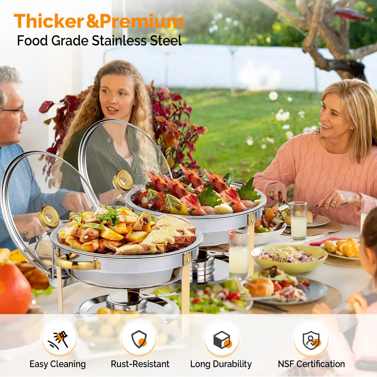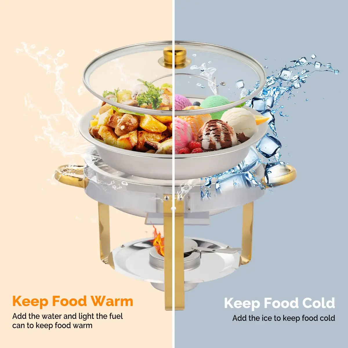 2. Gold Chafing Dishes: Featuring an elegant gold & silver design, these dishes provide a luxurious metallic finish, perfect for displaying catering food straight from the oven to the buffet table. Ideal for restaurants, hotels, and commercial use.