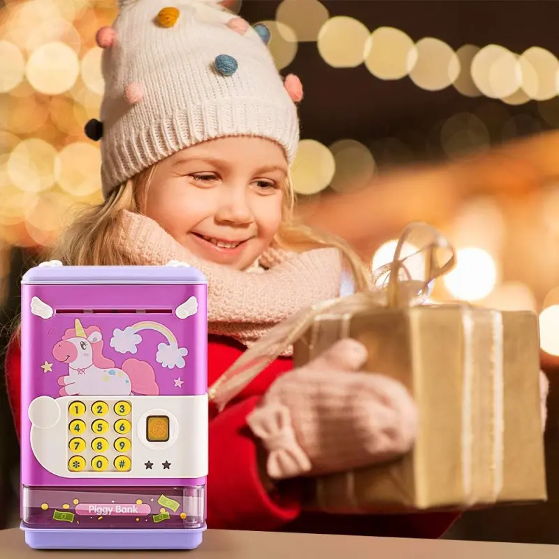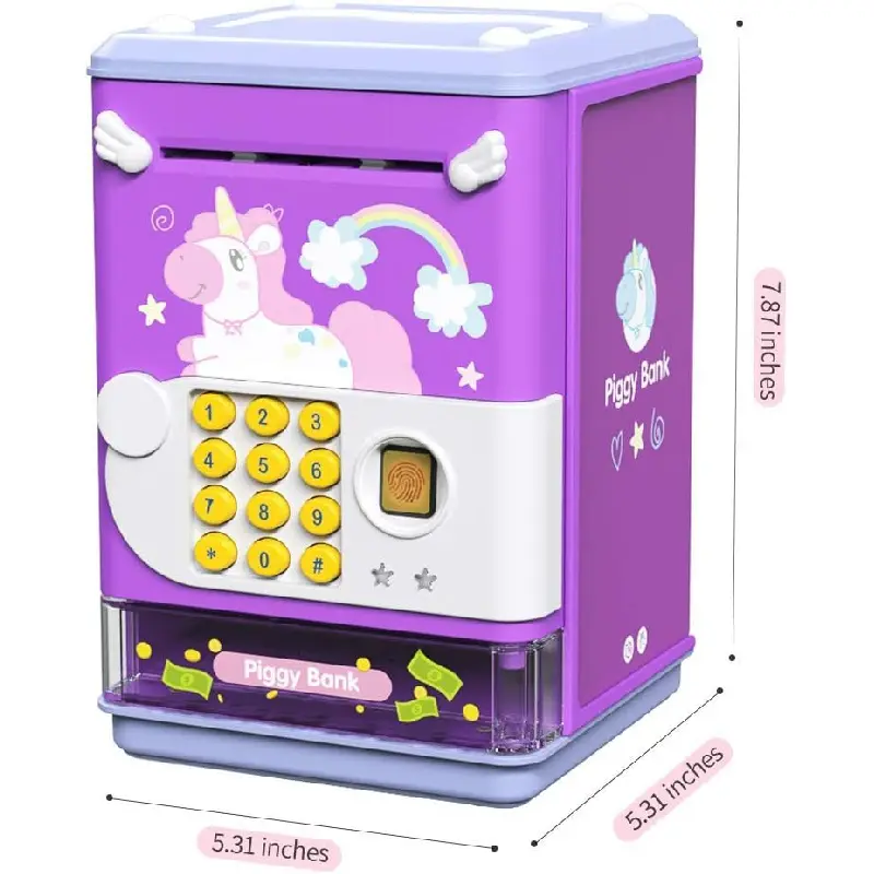 This 5.31 inch*5.31 inch*7.87 inch piggy bank allows your to save way more money than they think!Your will be surprised how much money he/she can save up.
